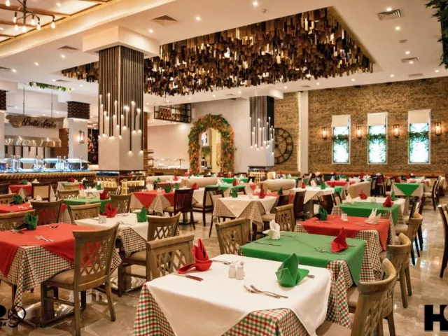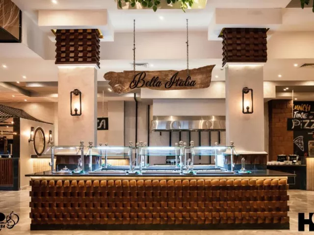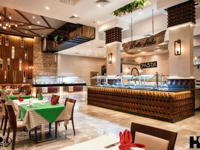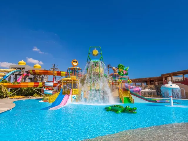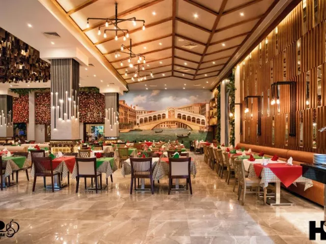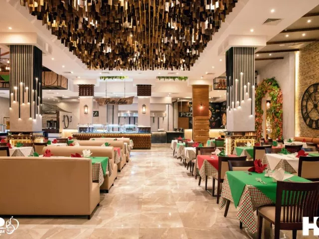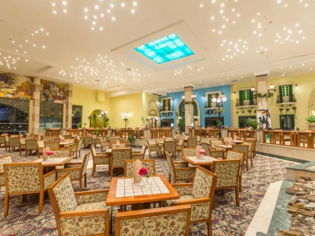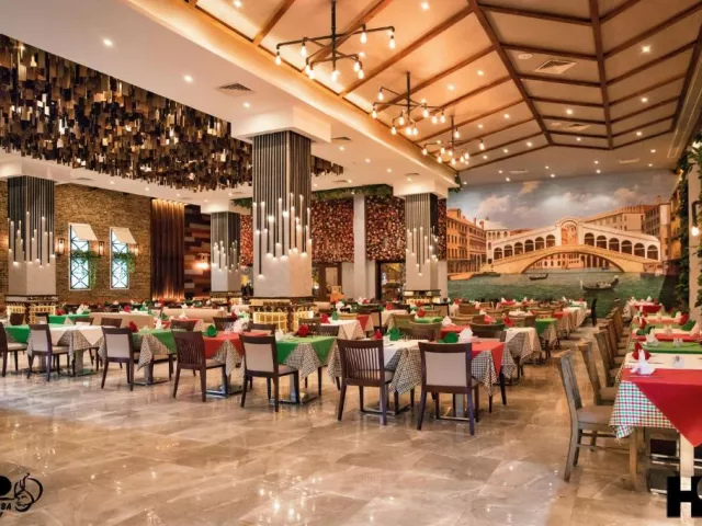 Hotelový areál zahŕňa recepciu s lobby barom, niekoľko barov a reštaurácií, konferenčnú sálu, zmenáreň a nákupnú pasáž. V nádherne upravenej záhrade sa rozprestiera rozsiahla sústava bazénov s plochou 2 700 m², okrem detského bazéna tu nájdete aj bar pri bazéne a terasu na slnenie s ležadlami a slnečníkmi zdarma. Animačné programy a zábava s rôznymi tematickými show sú taktiež súčasťou ponuky. Wi-Fi pripojenie je k dispozícii zdarma v lobby, zatiaľ čo internetový kútik je za poplatok.