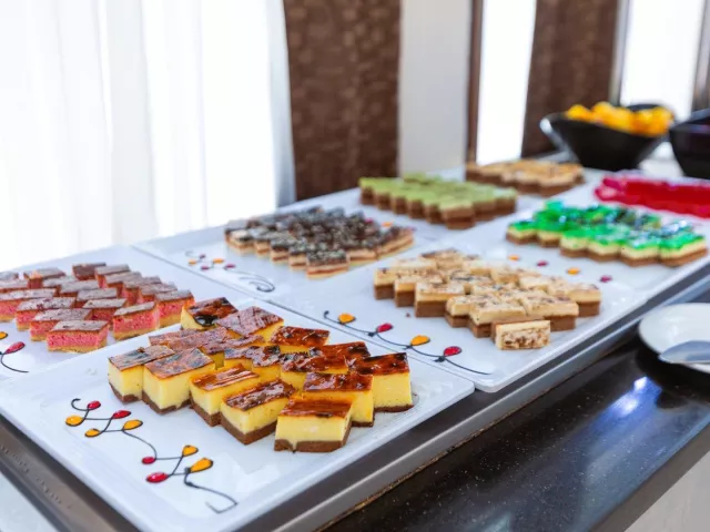 Hotel ponúka all inclusive stravovanie formou bufetu s raňajkami, obedom a večerou, ako aj medzinárodnými a miestnymi nápojmi v baroch.