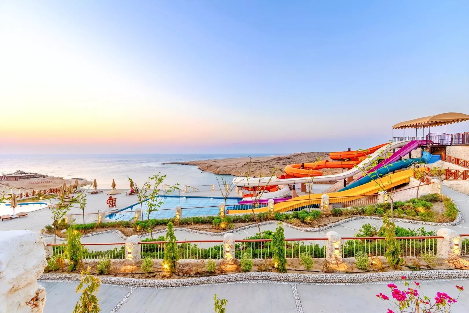 Krásna piesočnatá pláž v zátoke lemovaná koralom. Dostupná po schodoch alebo je možné využiť shuttle bus (zadarmo). Lehátka, slnečníky a osušky zadarmo, plážový bar.