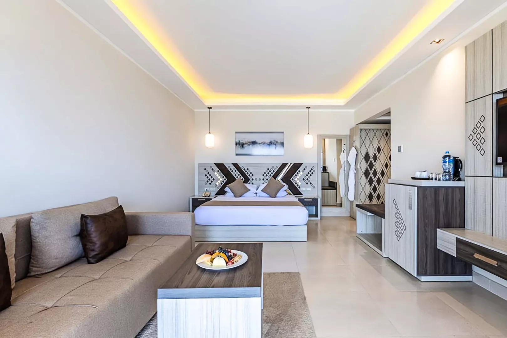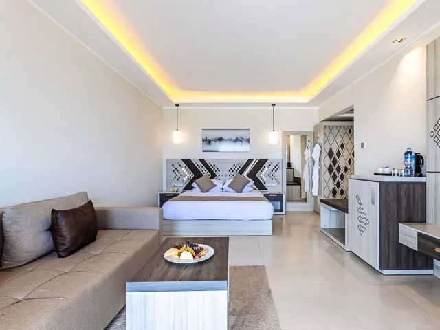 Štandardné izby sú vybavené vlastným sociálnym zariadením, klimatizáciou, SAT/TV, minibarom, trezorom, a disponibilným WiFi pripojením (za poplatok). Izby majú balkón alebo terasu s bočným výhľadom na more. K dispozícii sú aj Deluxe izby pre hostí starších ako 14 rokov a izby Superior s moderným zariadením.