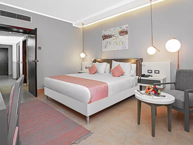Izby zahŕňajú dvojposteľovú Deluxe izbu s výhľadom na bazén, ktorá je vybavená klimatizáciou, Wi-Fi (zdarma), trezorom, balkónom alebo terasou, setom na prípravu čaju a kávy, TV so satelitným príjmom, telefónom a minibarom (za poplatok). K dispozícii sú aj ďalšie typy izieb vrátane rodinnej izby a izieb Premium s rôznymi výhľadmi. Hotel ponúka denné a večerné animačné programy určené pre deti aj dospelých. Niekoľko izieb je prispôsobených pre osoby so zdravotným postihnutím.