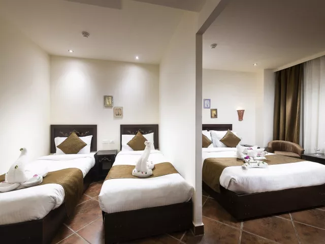 Hotel Three Corners Sea Beach poskytuje pohodlné ubytovanie v moderných a priestranných izbách, ktoré sú vybavené všetkým potrebným pre príjemný pobyt. Hostia si môžu vybrať izby s výhľadom na more, čo zaručuje nádherné výhľady. Vybavenie izieb zahŕňa klimatizáciu, TV, minibar a súkromnú kúpeľňu.