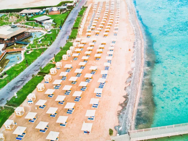 Dlhá piesočnatá pláž sa nachádza priamo pred hotelom, s pozvoľným vstupom do mora cez koralové podložie. Pre pohodlný vstup do hlbšej vody je k dispozícii mólo. Plážový servis, vrátane ležadiel a slnečníkov, je poskytovaný zdarma.