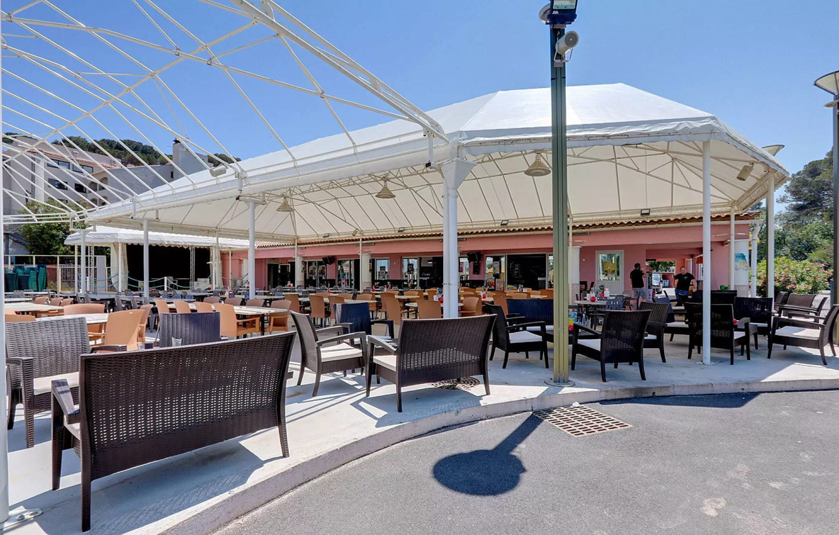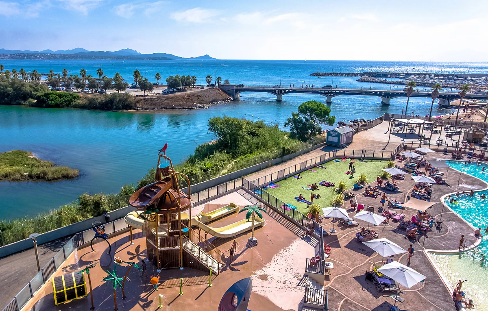 vodný park 2000 m², vonkajší bazén (mimo hlavnej sezóny vyhrievaný) s ležadlami a detským bazénom, multifunkčné športové ihrisko, vonkajšia dráha na pétanque; tenisový kurt, cyklotrasy (požičovňa bicyklov v blízkosti*), v blízkosti centrum vodných športov* – požičovňa kajakov, paddleboardov a windsurfov, výlety loďou, plachetnicou, katamaránom * služby za príplatok