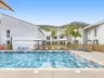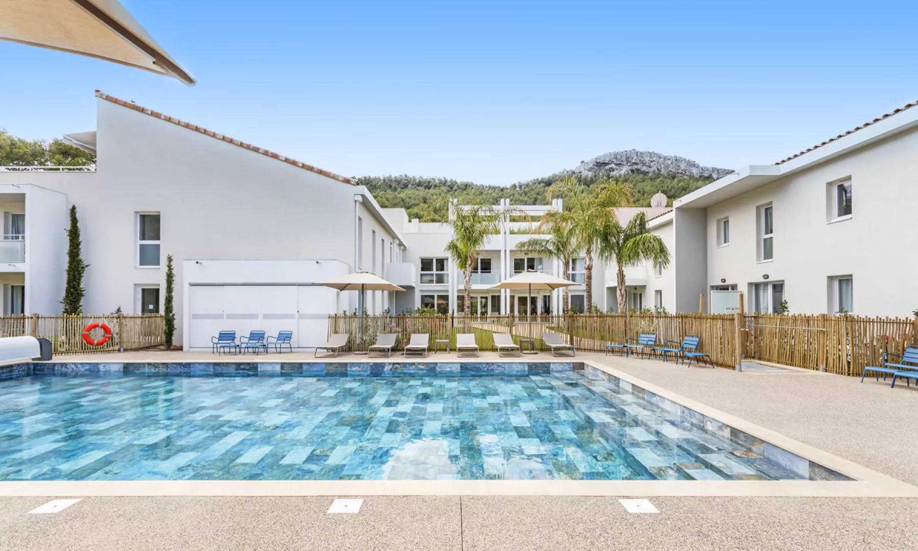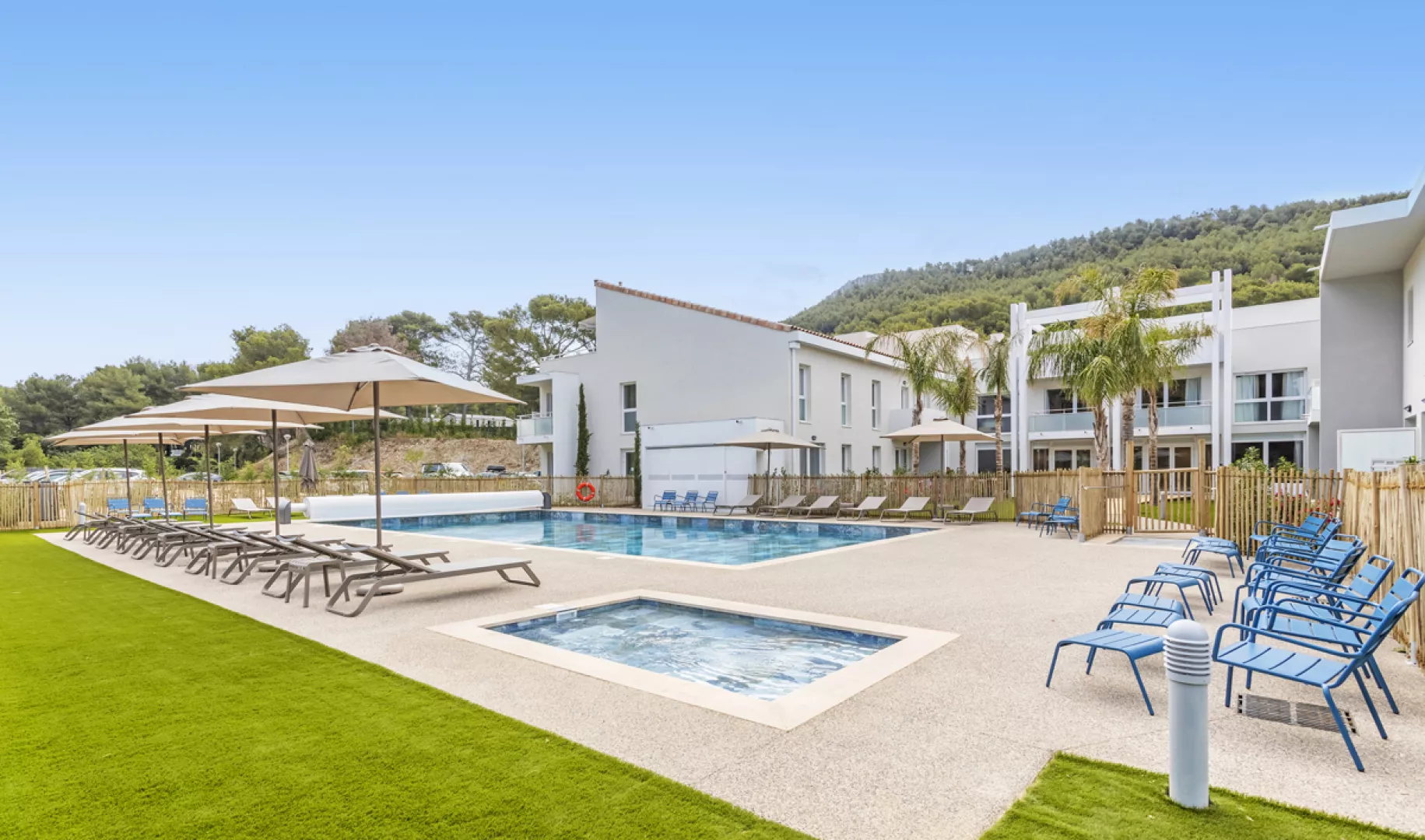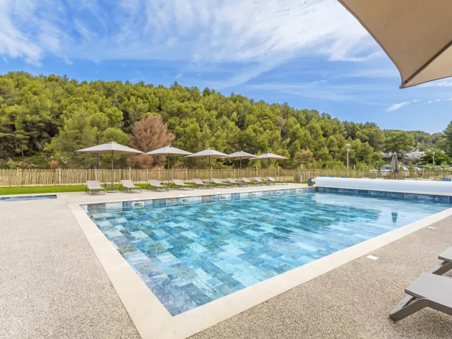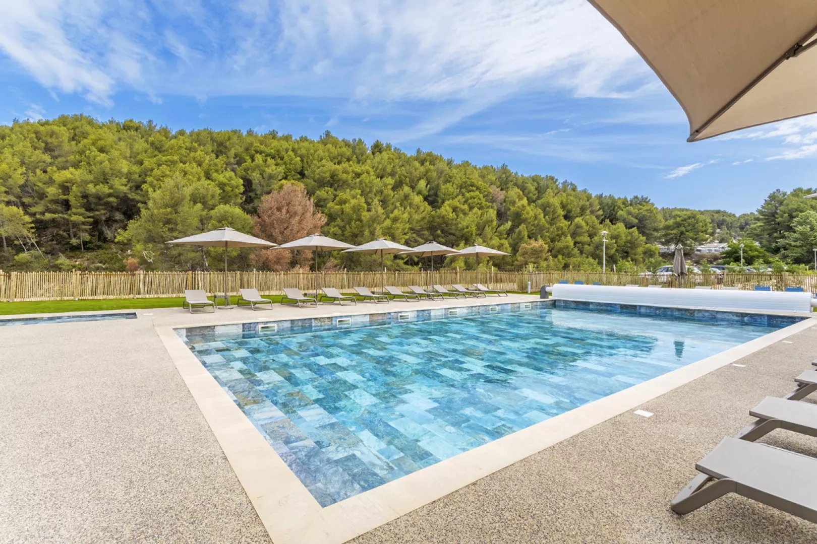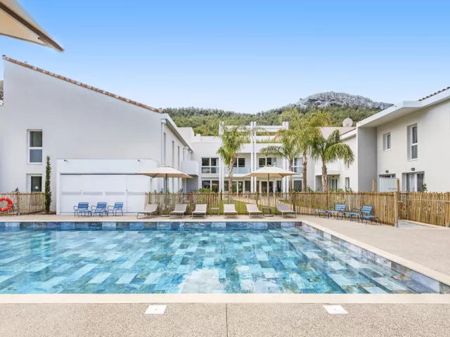 Rezidenčný komplex s bazénom uprostred borovicového hája.