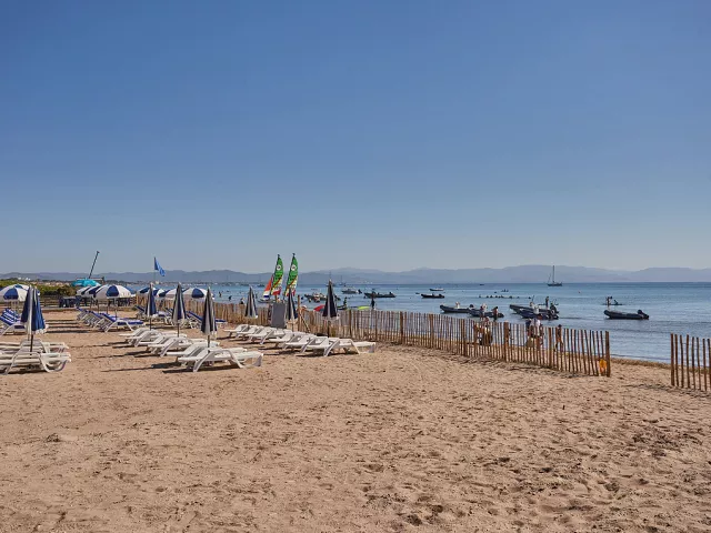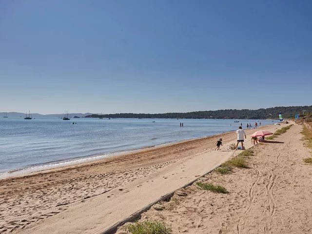 Hyères – lokalita Giens / Plage de la Bergerie, piesočnatá pláž s pozvoľným vstupom do mora – do 100 m, centrum Giens – 2 km