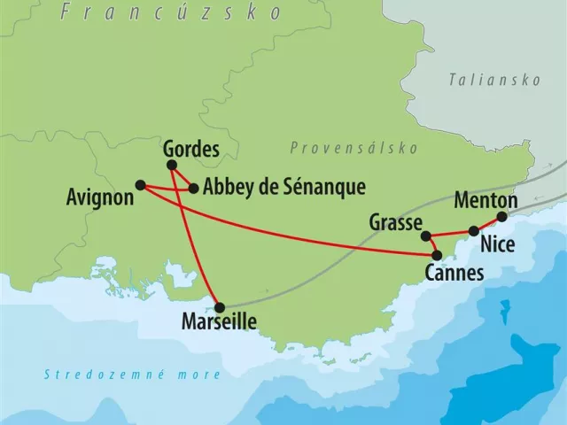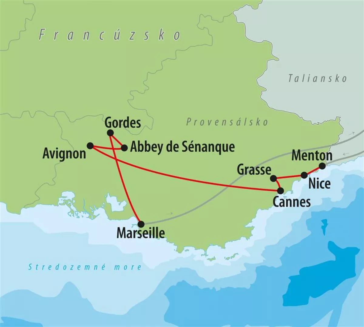 V rámci programu môžete navštíviť: Menton, Monaco, Grasse, Cannes, Orange, Chateauneuf-du-Pape, Avignon, Pont du Gard, Aix-en-Provence a Marseille.