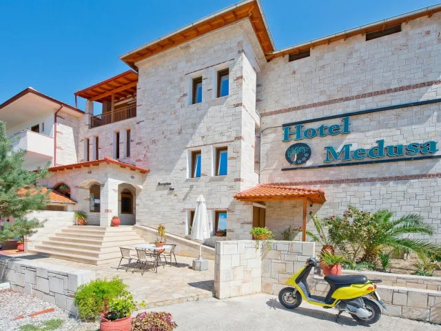 Medusa Aparthotel sa nachádza neďaleko centra Kryopigi, čo umožňuje pohodlný prístup k autobusovej zastávke a minimarketu. Väčšie obchody s potravinami, suvenírmi, reštaurácie a bary sú vzdialené približne 400 m od hotela. Letisko Thessaloniki (SKG) je vzdialené približne 82 km.
