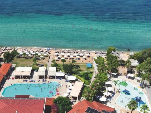 Rezort sa nachádza v letovisku Nea Potidea, kde areál s upravenou záhradou pozostáva z hlavnej hotelovej budovy a viacerých viliek postavených v typickom gréckom štýle. Priamo ústi do nádhernej piesočnatej pláže ocenenej Modrou vlajkou EÚ za kvalitu a čistotu. Pláž má veľmi mierny vstup do mora, pričom ležadlá a slnečníky sú k dispozícii zdarma. V areáli je taktiež hotelový autobus do dedinky Nea Potidea.