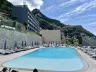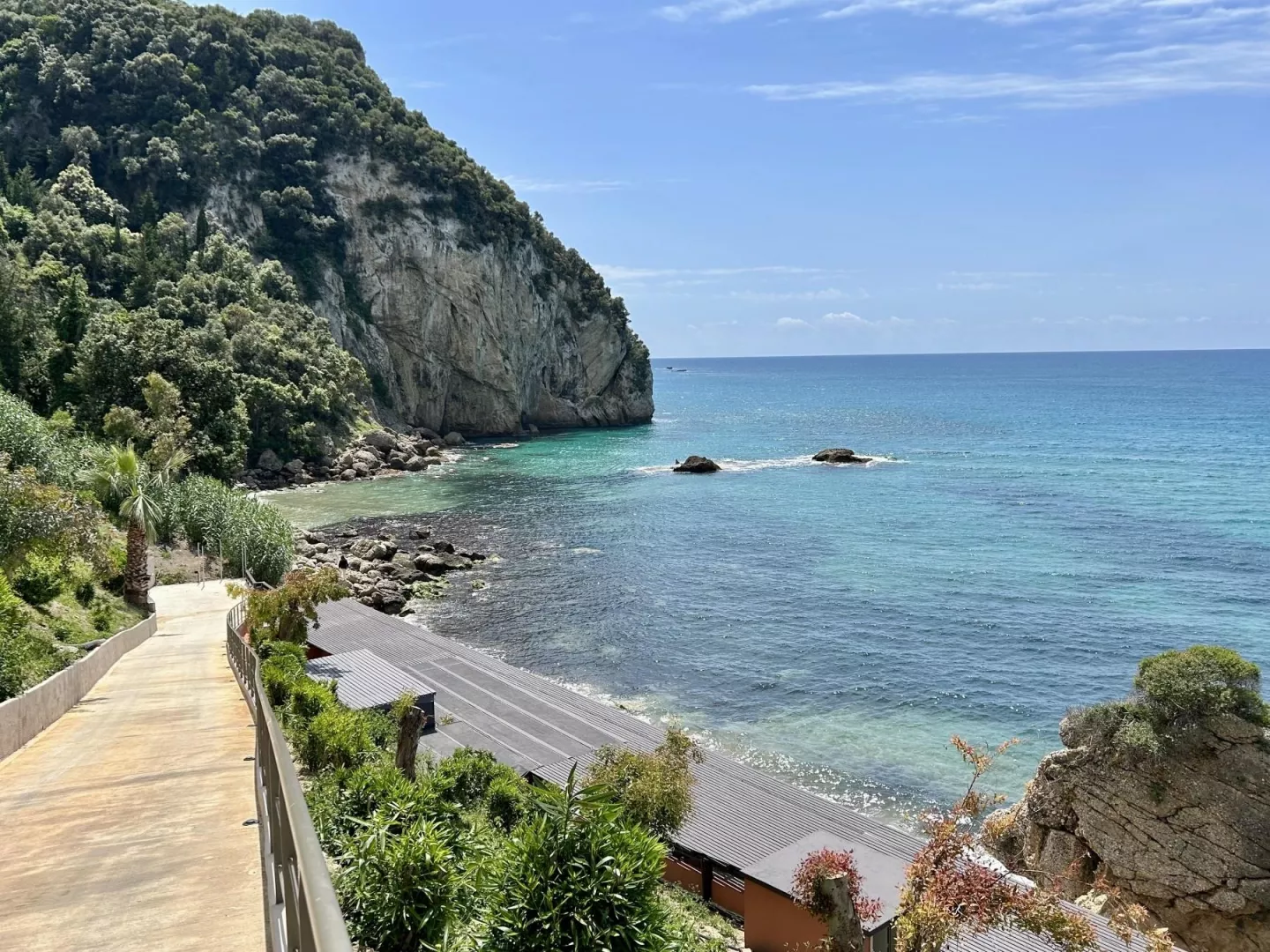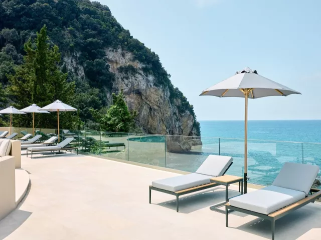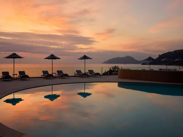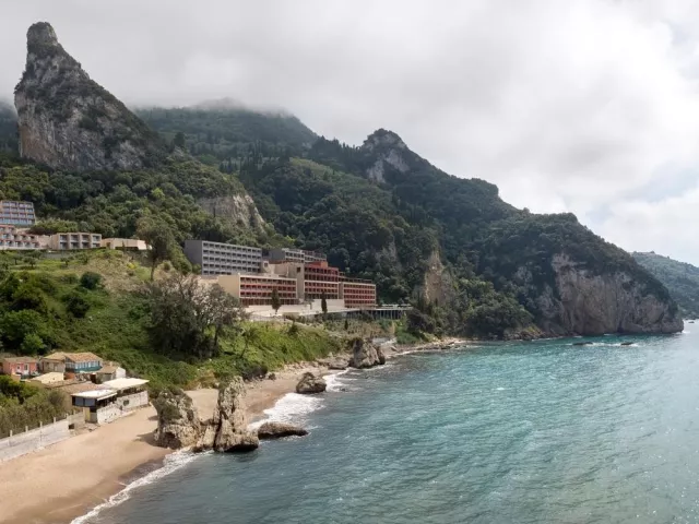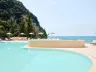 Piesočnato-okruhliaková pláž priamo pod hotelom (cca 50 m). Lehátka, slnečníky a osušky zadarmo. Bar na pláži. Prístup na pláž po schodoch.