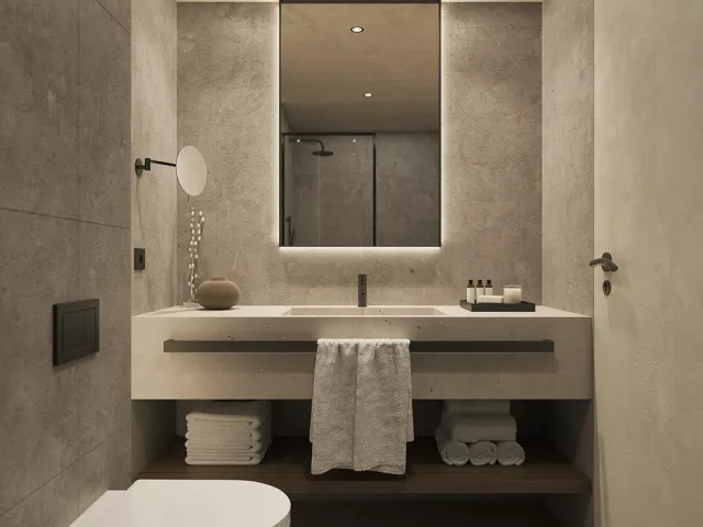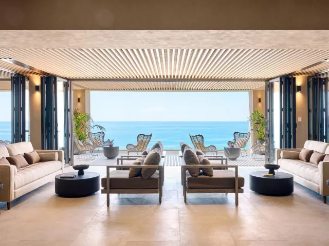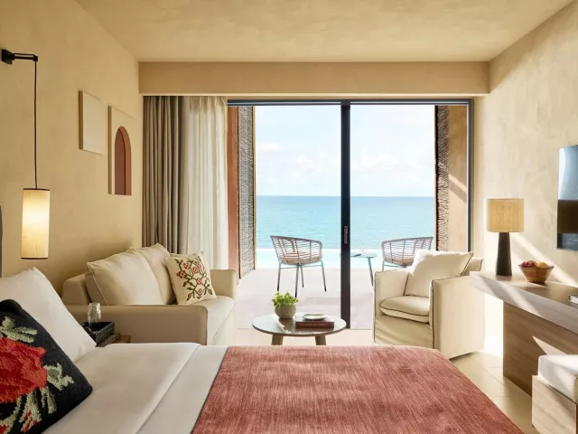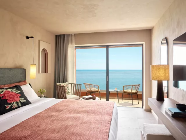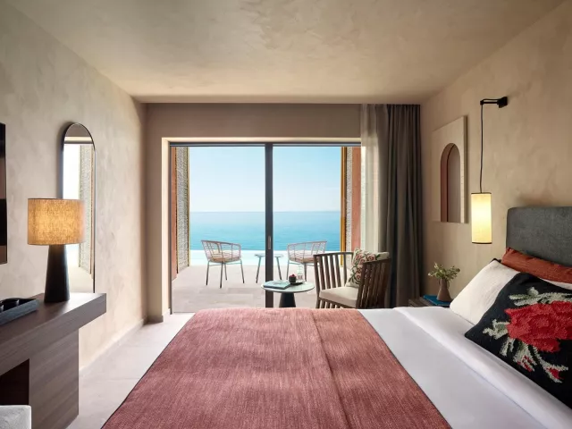 Dvojlôžková izba, Comfort : kúpeľňa/WC (sušič vlasov), individuálna klimatizácia, telefón, TV/sat., wifi na izbe, minibar (denne doplňovaný nealkoholickými nápojmi), elektronický trezor, set na prípravu kávy a čaju, plážové/bazénové osušky, župan a papuče, 21m2, iba pre 2 osoby. Ostatné typy izieb (pokiaľ nie je uvedené inak, majú izby vyššie uvedené vybavenie) Dvojlôžková izba, Deluxe, Výhľad mora: priestrannejšia izba, výhľad na more, 22-26m2. Dvojlôžková izba, Premium, Výhľad mora, Swim-up: priestrannejšia izba, výhľad na more, priamy vstup do bazéna, 26m2. Junior Suita, Výhľad mora: priestrannejšie, až pre 3 osoby, rozkladacia sofa, výhľad na more, 28-30m2. Junior Suita, Výhľad mora, Swim-up: priestrannejšie, až pre 3 osoby, rozkladacia sofa, priamy vstup do bazéna, výhľad na more, 28-30m2. Penthouse Suita, Výhľad mora: priestrannejšie, až pre 3 osoby, oddelená spálňa, rozkladacia sofa, panoramatický výhľad na more, 28-30m2. Suita, Open Plan, Výhľad mora, Zdieľaný bazén: priestrannejší, až pre 3 osoby, oddelená spálňa, rozkladacia sofa, panoramatický výhľad na more, prístup do zdieľaného bazéna, 35m2.