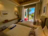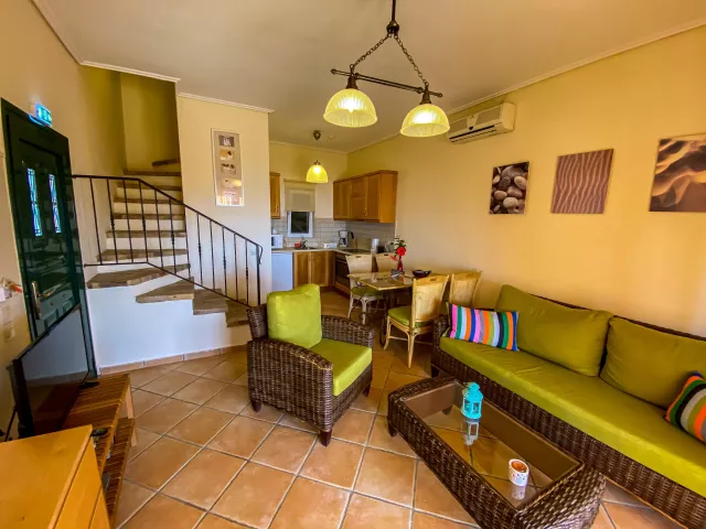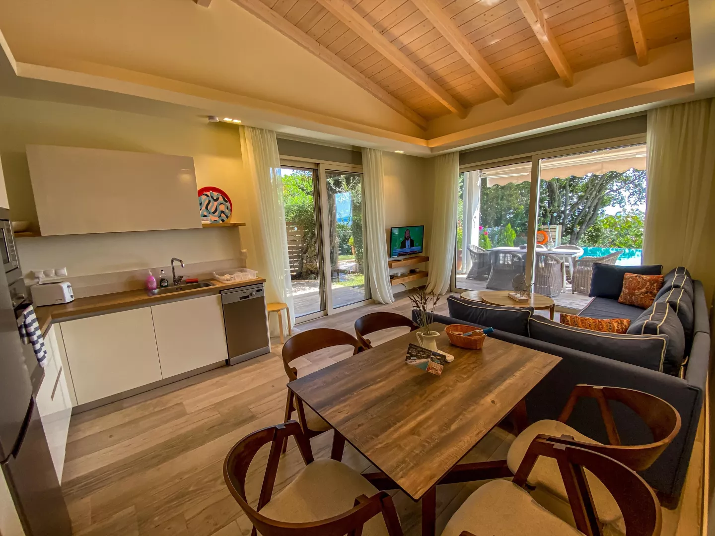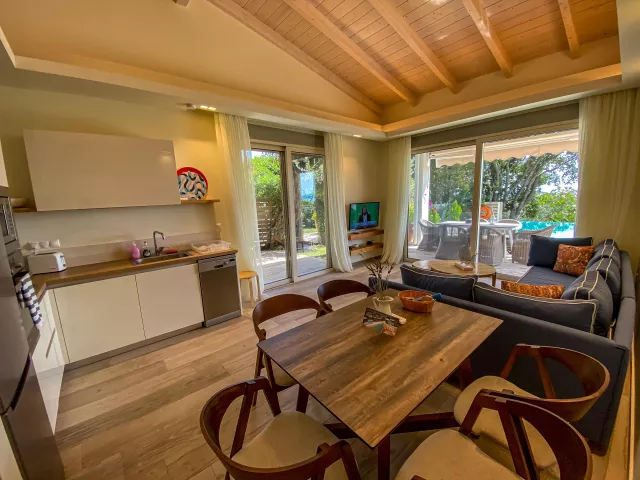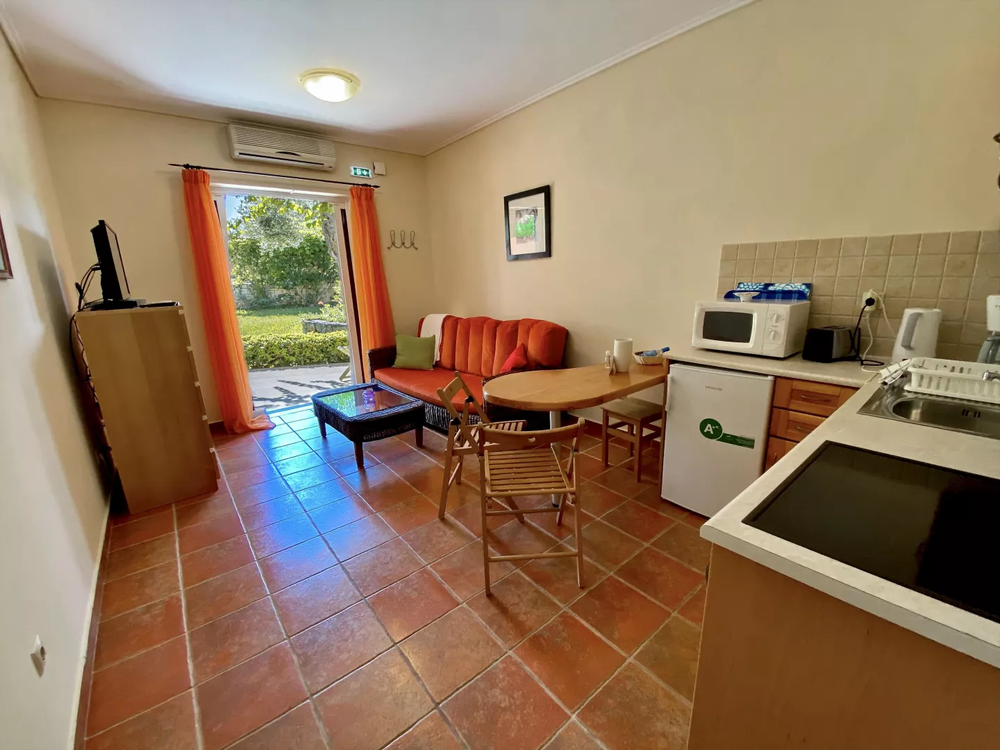 Studio, Výhľad do záhrady: kúpeľňa/WC, TV/sat, sušič vlasov, telefón, trezor, individuálna klimatizácia, plne vybavená kuchyňa (mikrovlnná rúra, elektrický sporák, chladnička, rýchlovarná kanvica, kávovar, hriankovač), nachádza sa na prízemí (terasa), max. pre 3 osoby, prístelka v podobe pohovky, výhľad do záhrady, 33m2. Ostatné typy izieb (ak nie je uvedené inak, izby majú vyššie uvedené vybavenie) Apartmán, 1 spálňa, výhľad do záhrady: priestrannejší, samostatná spálňa, rozkladacia pohovka navyše, balkón alebo terasa, výhľad do záhrady, max. pre 3 osoby, 40m2. Apartmán, 2 spálne, výhľad do záhrady: priestrannejší, 2 oddelené spálne, umývačka riadu, prístelka pre 5. osobu vo forme pohovky, balkón alebo terasa, výhľad do záhrady, max. pre 5 osôb, 66m2. Apartmán, 2 spálne, výhľad na more: priestrannejší, 2 samostatné spálne, umývačka riadu, prístelka pre 5. osobu vo forme pohovky, balkón alebo terasa, čiastočný výhľad na more, izby najbližšie k moru, max. pre 5 osôb, 66m2. Mezonet, 1 spálňa, výhľad do záhrady: dvojpodlažný apartmán, na poschodí 1 spálňa a 1 kúpeľňa, na prízemí kuchyňa, obývacia časť, WC a umývačka riadu, prístelky vo forme rozkladacieho gauča a pohovky, balkón alebo terasa, výhľad do záhrady, max. pre 2+2 osoby, 50m2. Mezonet, 1 spálňa, súkromný bazén, výhľad do záhrady: dvojpodlažný apartmán, na poschodí 1 spálňa a 1 kúpeľňa, balkón s výhľadom do záhrady, dole kuchyňa, obývacia časť, toaleta a umývačka riadu, prístup k súkromnému bazénu, terasa, prístelky v podobe pohovky a rozkladacieho lôžka, max. pre 2+2 osoby, 55m2. Mezonet, 2 spálne, súkromný bazén, výhľad do záhrady: dvojpodlažný apartmán, na poschodí 2x spálňa a 1x kúpeľňa, balkón s výhľadom do záhrady, dole kuchyňa, obývacia časť, WC a umývačka riadu, prístup k súkromnému bazénu, terasa, prístelka pre 5. osobu vo forme pohovky, max. pre 5 osôb, 75m2. Mezonet, 3 spálne, súkromný bazén, výhľad na more: dvojpodlažný apartmán, na poschodí 2x spálňa a 2x kúpeľňa, 2x balkón s výhľadom na more, dole 1x spálňa a 1x kúpeľňa, kuchyňa, obývacia časť, umývačka riadu + práčka, prístup k súkromnému bazénu, terasa, max. pre 6 osôb, 100m2, na vyžiadanie. Vila, 2 spálne, súkromný bazén, výhľad na more: 2x spálňa a 2x kúpeľňa, súkromný nekonečný bazén (mimo sezóny vyhrievaný), terasa s prístupom do záhrady, práčka a umývačka riadu, wifi a Smart TV/sat, rozkladacia pohovka navyše, max. pre 5 osôb, 80m2, na vyžiadanie.