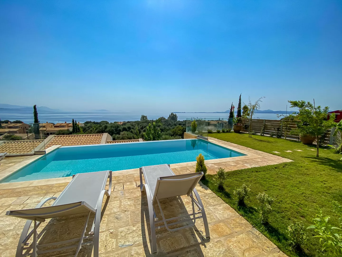 vonkajší bazén s výhľadom na more ležadlá a slnečníky pri bazéne grécka reštaurácia snack bar detské ihrisko detský bazén parkovisko