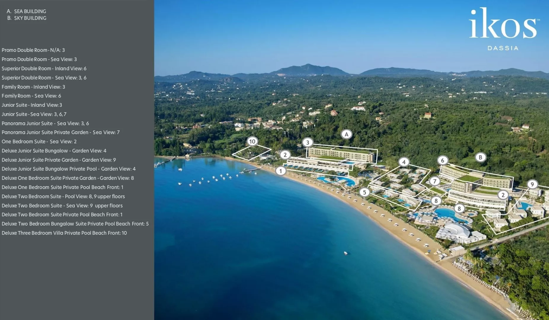 Oba hotely sú situované na okraji mesta Dassia, pričom Ikos Dassia je vzdialený približne 100 m od turistickej ulice s mnohými tavernami, obchodmi a barmi. Ikos Odisia sa nachádza asi 400 metrov od rovnakých atrakcií. Hlavné mesto Korfu je vzdialené približne 11 - 17 km od oboch hotelov, s pravidelným autobusovým spojením.