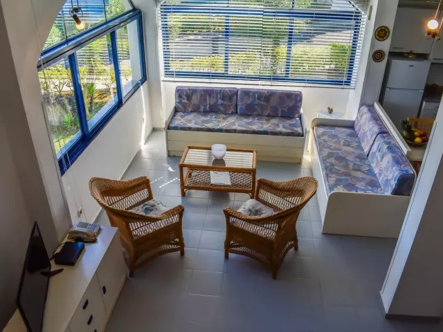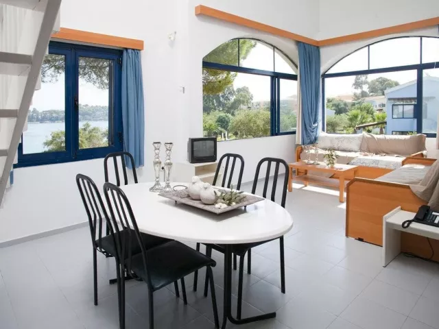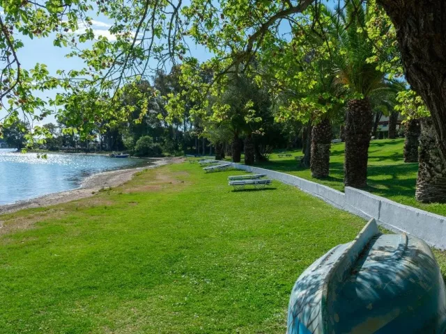 Priamo pri ubytovaní sa nachádza okruhliaková pláž, kde sú lehátka a slnečníky zdarma. Ďalšia okruhliaková pláž Gouvia je vzdialená cca 1 km a lehátka a slnečníky sú k dispozícii za poplatok od miestnych poskytovateľov.