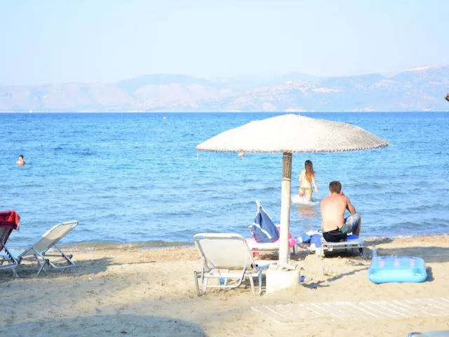 Piesočnatá pláž Kavos, s pozvoľným vstupom do mora, sa nachádza asi 170 m od ubytovania; slnečníky a lehátka sú k dispozícii za poplatok od miestnych poskytovateľov služieb.