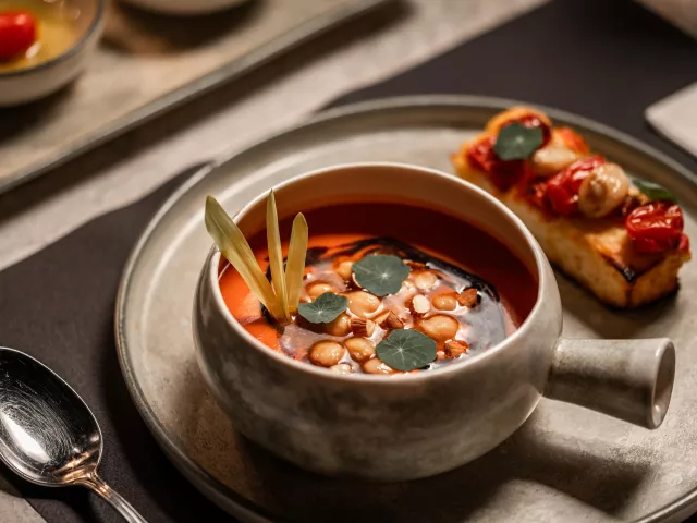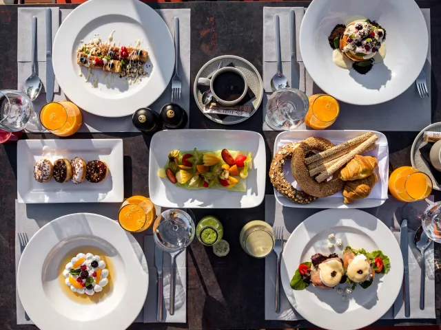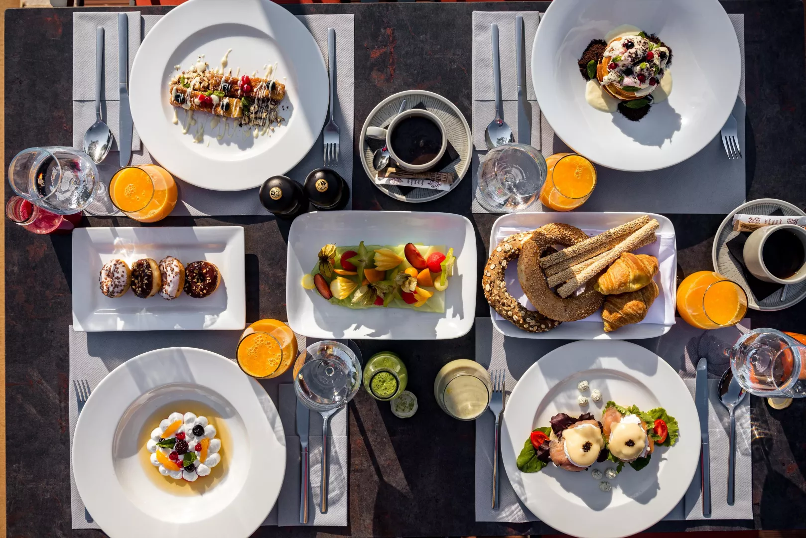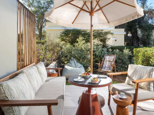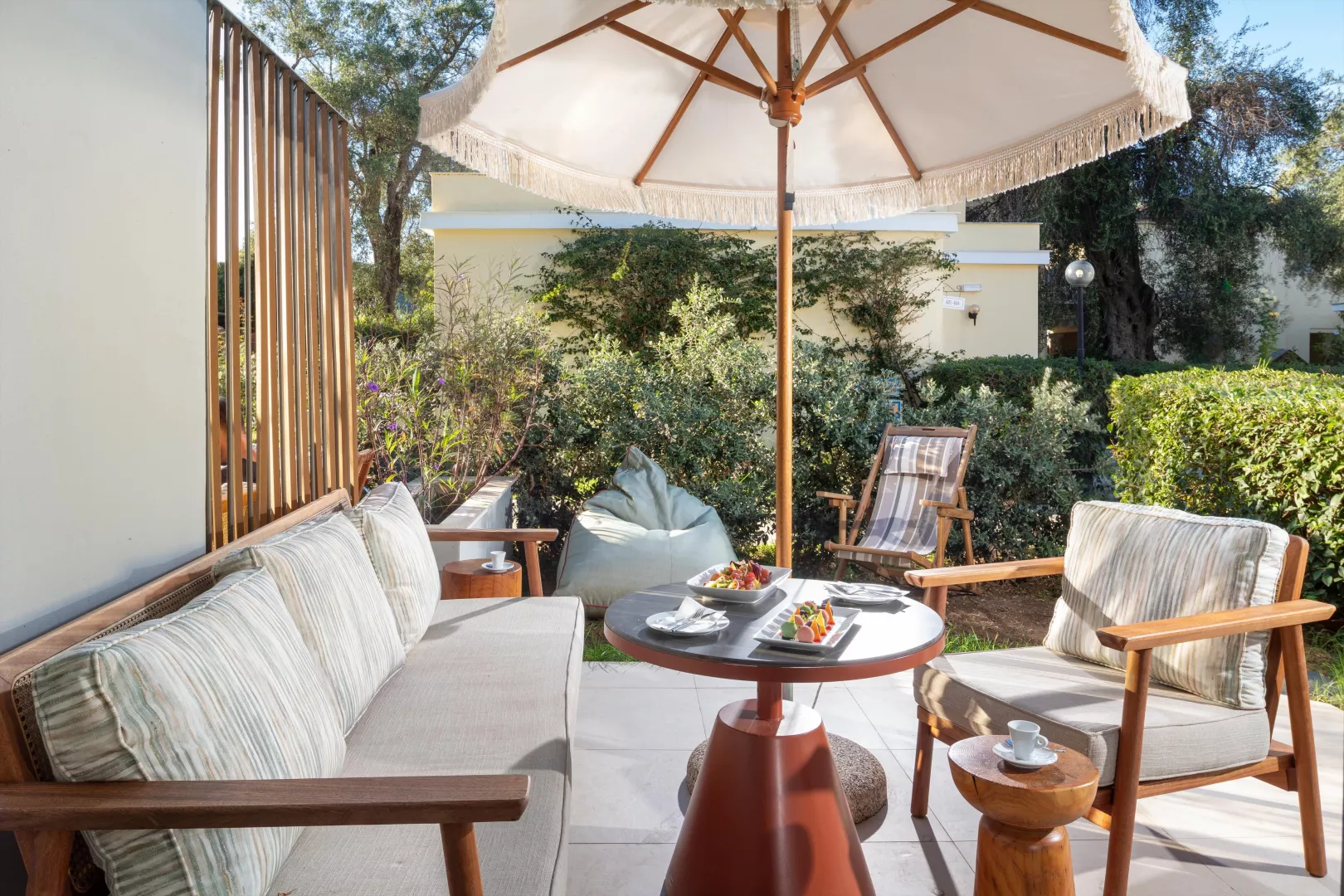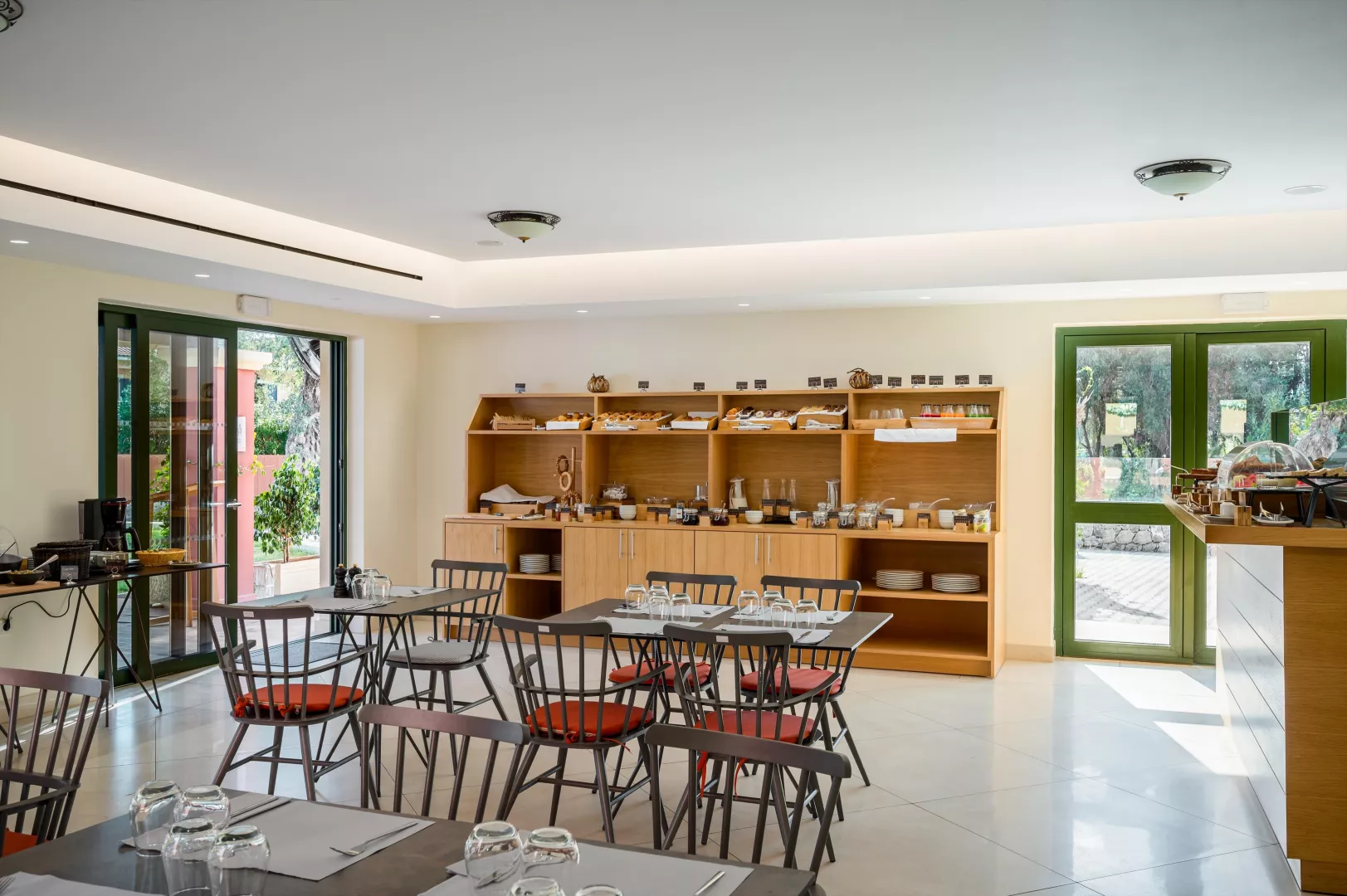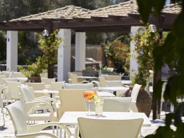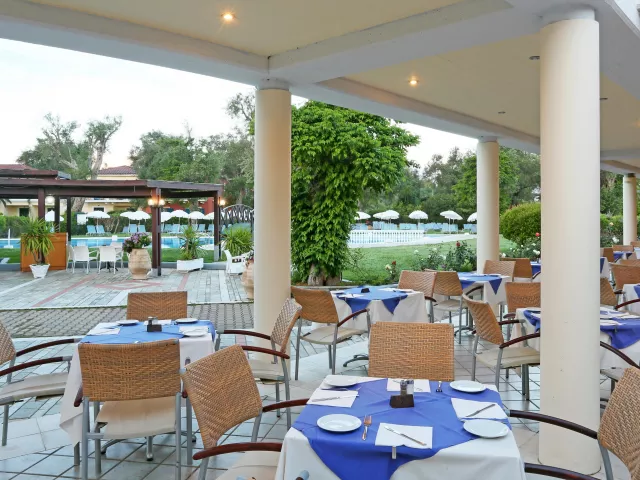 Stravovanie formou all inclusive zahŕňa skoré raňajky a bufetové raňajky v hlavnej reštaurácii, obedy a večere s medzinárodným bufetom a gréckymi prvkami. K dispozícii sú aj večere à la carte v špeciálnych reštauráciách, pričom nápoje sú dostupné v rôznych baroch podľa rozvrhu.