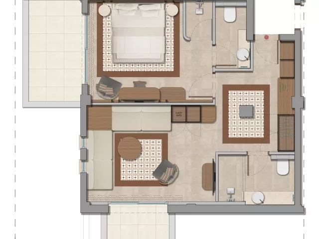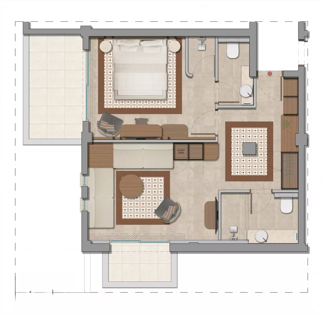 Izby sú vybavené kúpeľňou/WC (so sušičom vlasov), TV/sat, klimatizáciou, setom na prípravu kávy a čaju, telefónom, mini chladničkou, trezorom a wifi. Dostupné sú rôzne typy izieb: