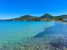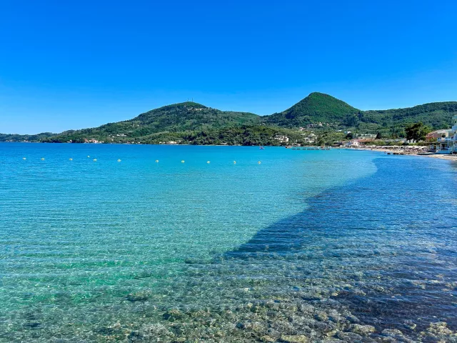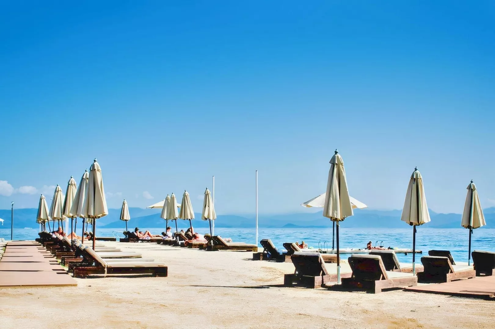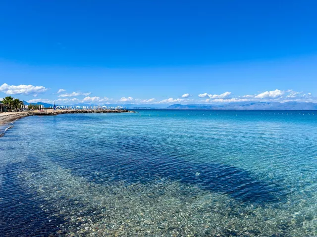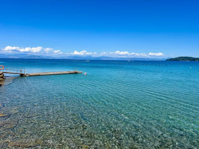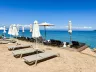 Piesočnato-kamienková pláž je vzdialená cca 200 m, k dispozícii sú slnečníky a ležadlá za poplatok (obmedzený počet). Plážové osušky sú dostupné na kauciu.