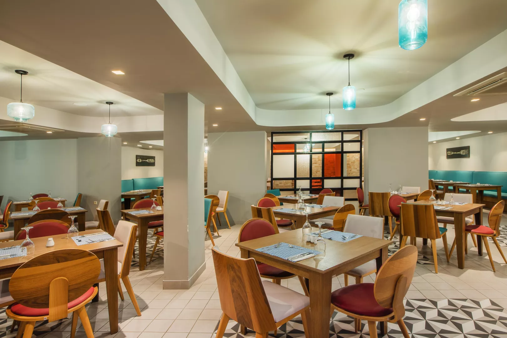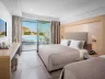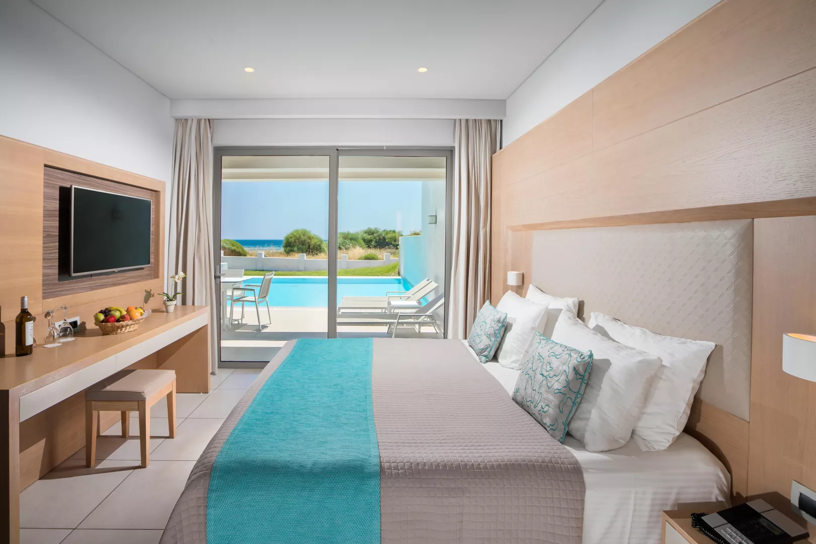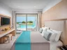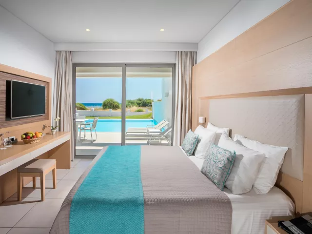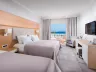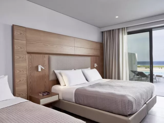Dvojlôžková izba : kúpeľňa/WC (sušič vlasov, župany, papuče), klimatizácia, TV/sat., chladnička (denne doplňovaná fľaša vody), trezor, telefón, set na prípravu kávy a čaju, balkón alebo terasa. Ostatné typy izieb (pokiaľ nie je uvedené inak, majú izby vyššie uvedené vybavenie) Dvojlôžková izba, Promo : situovaný v menej priaznivej polohe. Dvojlôžková izba, Superior, Výhľad smerom k moru : výhľad smerom k moru, Dvojlôžková izba, Výhľad na bazén, Zdieľaný bazén : priamy vstup k bazénu. Junior suite, Výhľad smerom k moru : 2 oddelené spálne, 4 pevné lôžka, výhľad smerom k moru, 48m2. Suite, Royal : 2 oddelené spálne, 2 TV/sat., 56m2. Rodinná izba: spálňa oddelená zaťahovacími dverami, 37 m2. K dispozícii niekoľko izieb pre handicapovaných (vždy na vyžiadanie podľa konkrétnych požiadaviek klienta).