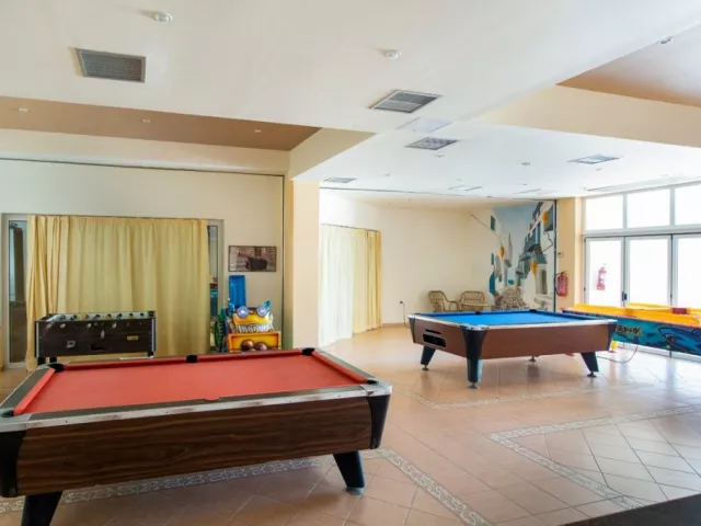 vstupná hala s recepciou výťahy (hlavná budova) hlavná reštaurácia hlavný bar s terasou bar pri bazéne snack bar pri bazéne slnečná terasa s ležadlami a slnečníkmi pri bazéne (zadarmo) bazén so slanou vodou integrovaný detský bazén minimarket vírivka pri vonkajšom bazéne posilňovňa (18+) herňa (za poplatok) detský klub malé detské ihrisko SPA s rôznymi procedúrami, kozmetickým salónom, saunou a krytým bazénom s vírivkou (sladká voda) za poplatok