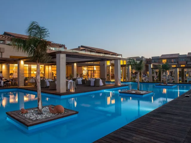 Hotel pozostáva z hlavnej budovy a priľahlých dvojposchodových budov. Nachádza sa tu vstupná hala s recepciou, hlavná reštaurácia a á la carte reštaurácie, bary, konferenčné sály a minimarket. V rozľahlej záhrade sú k dispozícii dva bazény s jacuzzi, detský bazén a terasa na slnenie s ležadlami, slnečníkmi a osuškami zdarma.