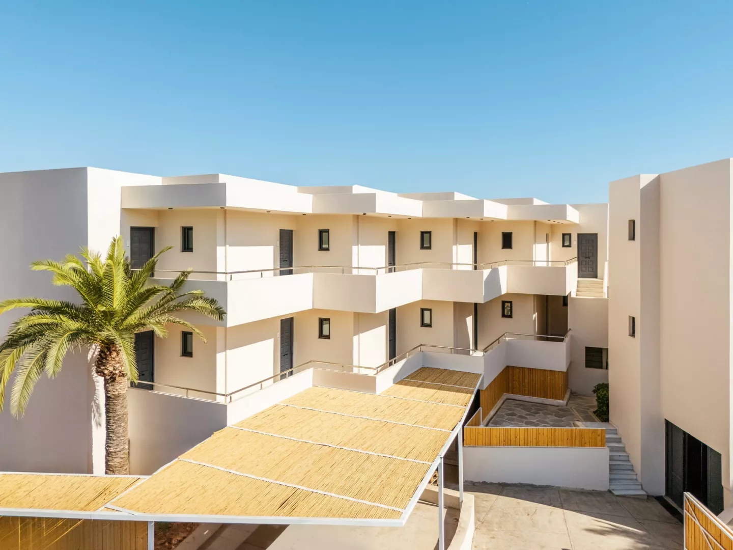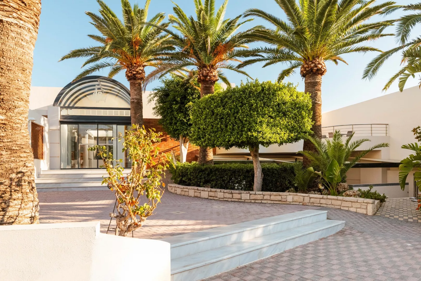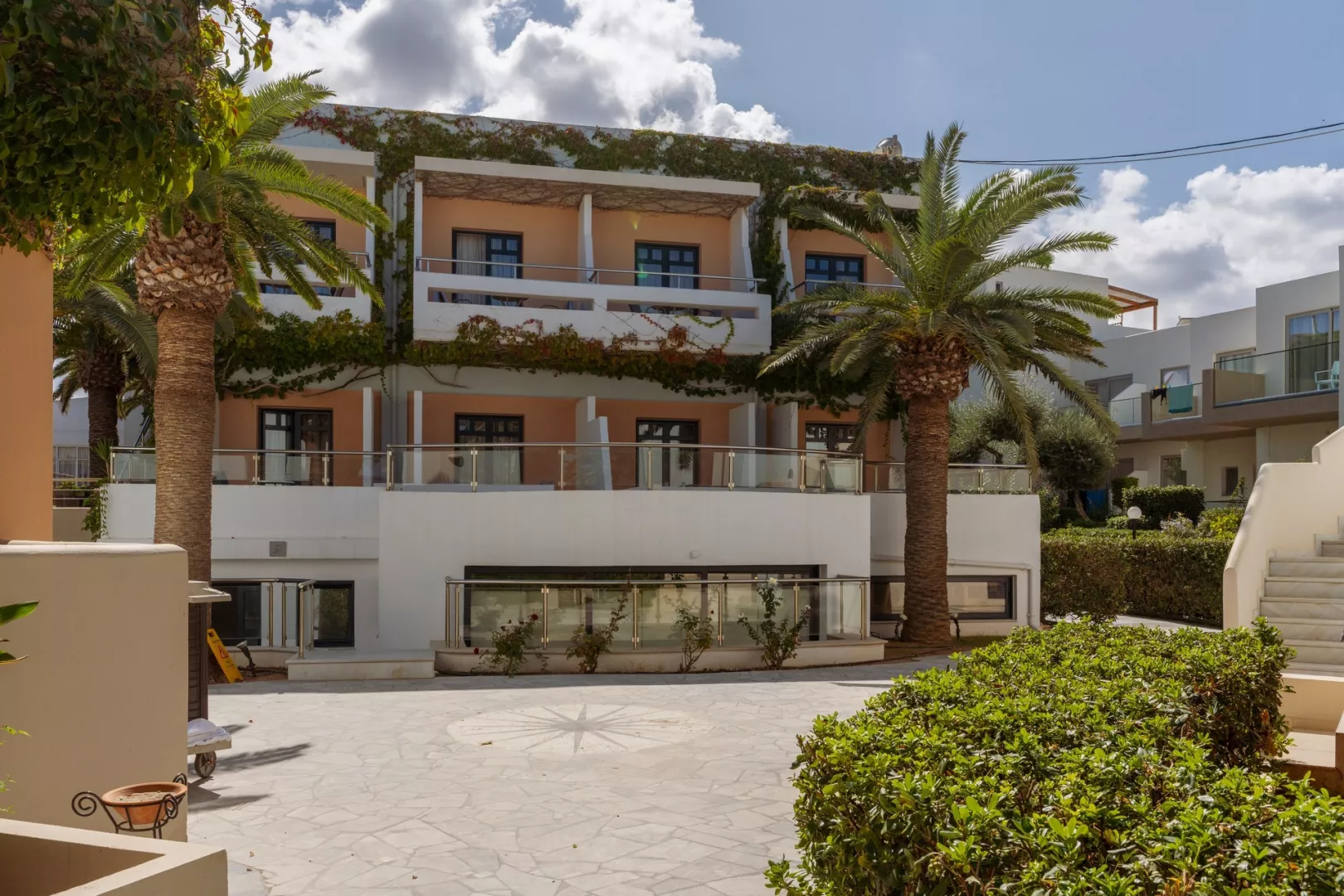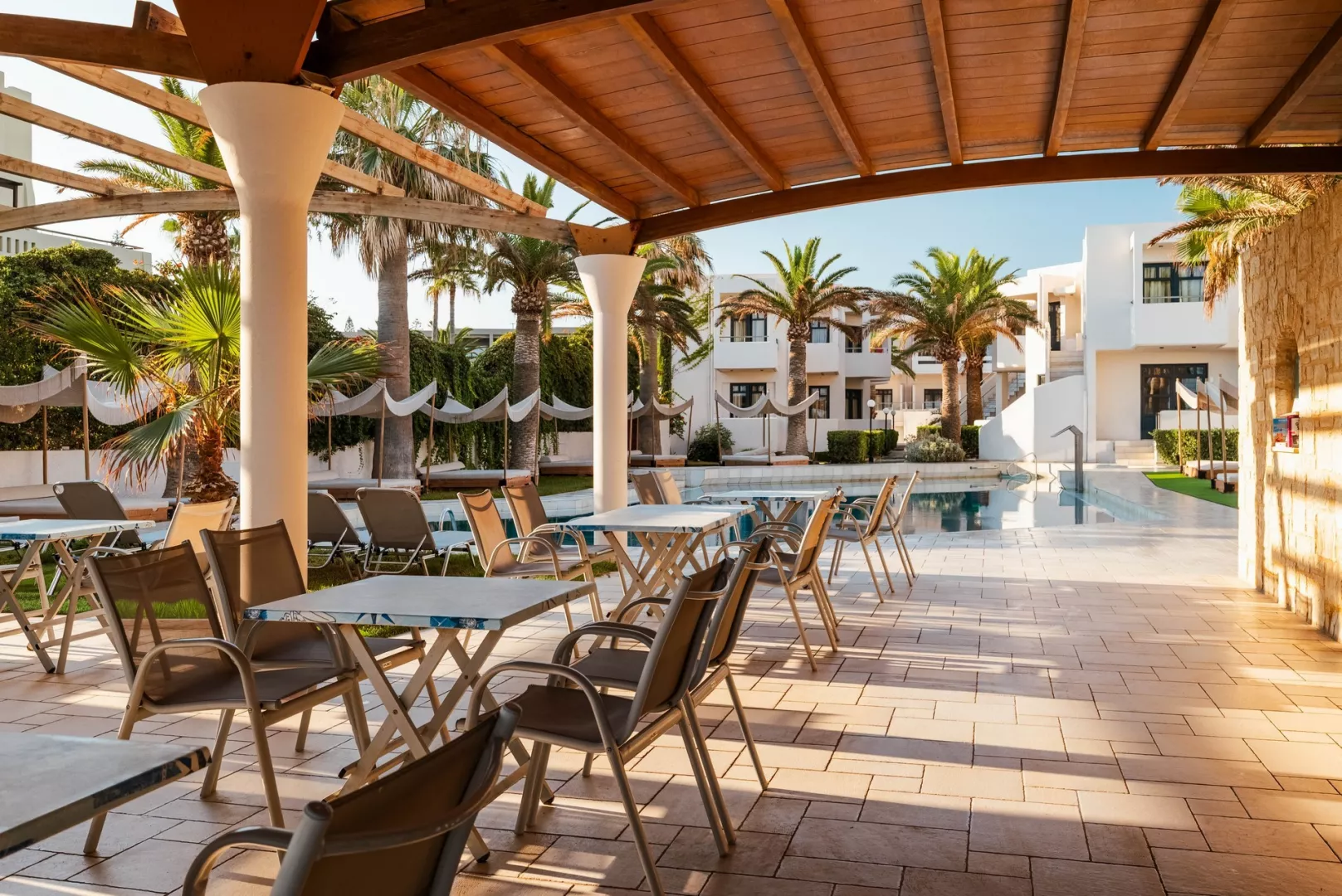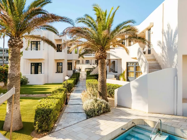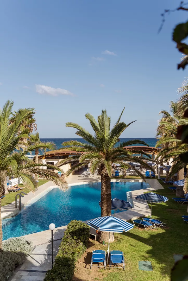 Hotelový komplex pre dospelých so 108 izbami je umiestnený v ôsmich dvojposchodových budovách, obklopený krásnou záhradou. Hostia môžu využiť vstupnú halu s recepciou a TV kútikom, reštauráciu, hlavný bar a snack bar na pláži. K dispozícii je bazén so sladkou vodou, ležadlá a slnečníky pri bazéne a na pláži. Hotel organizuje grécke večery so živou hudbou a tancom. Plážové osušky sú dostupné za poplatok. Podmienkou pobytu je vek minimálne 16 rokov.