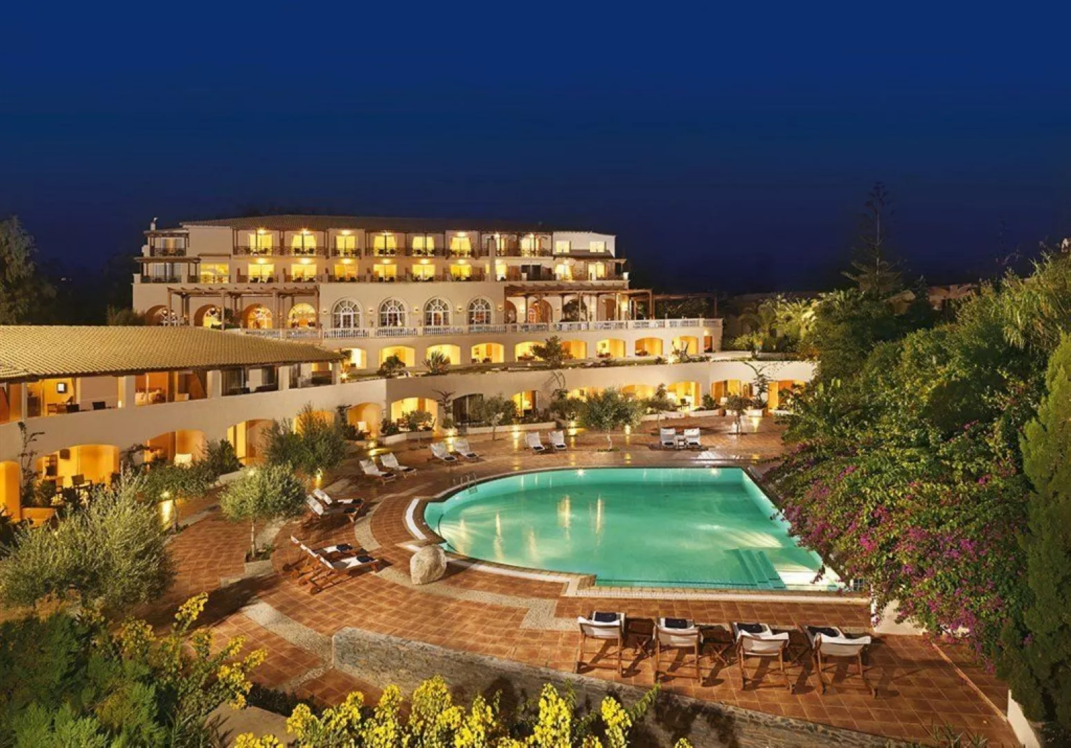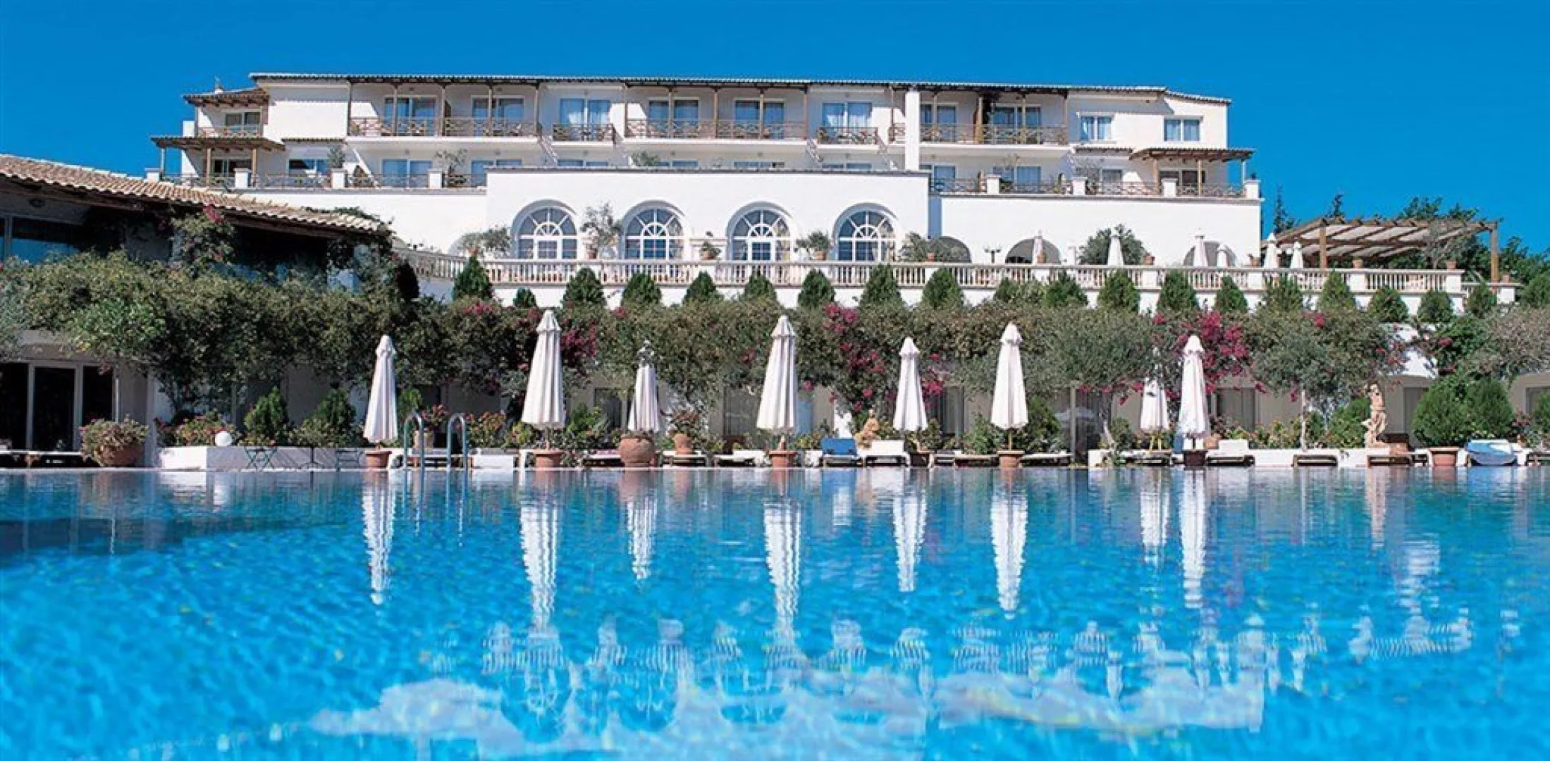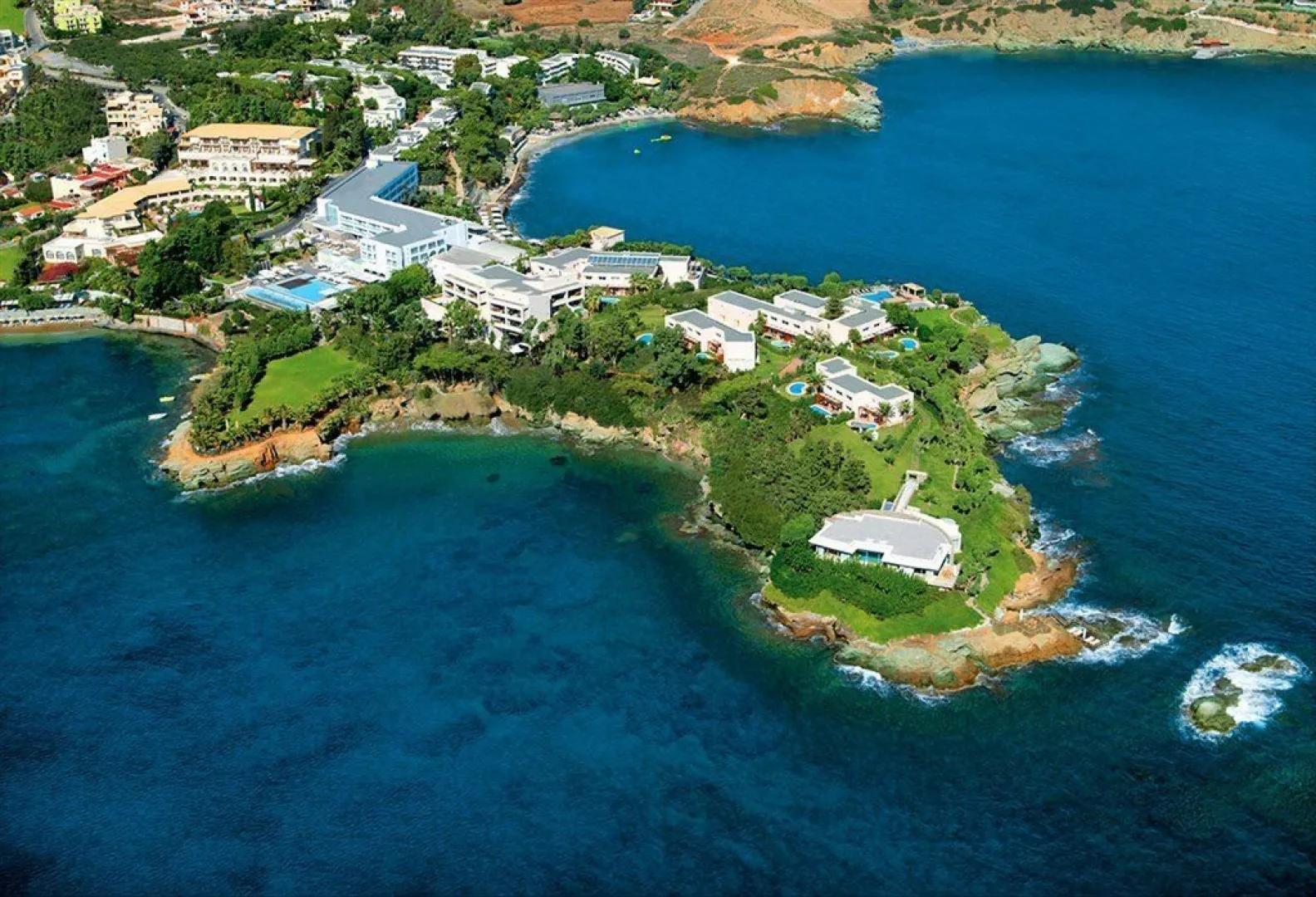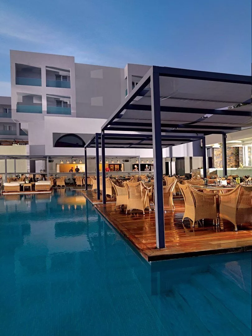 Hotel Out Of The Blue Beach Resort sa nachádza v krásnej záhrade na súkromnom poloostrove, približne 200 metrov od centra dedinky Agia Pelagia, kde sú k dispozícii obchody a bary. Je vzdialený asi 27 km od letiska v Heraklionu s autobusovou zastávkou len 20 metrov od hotela.