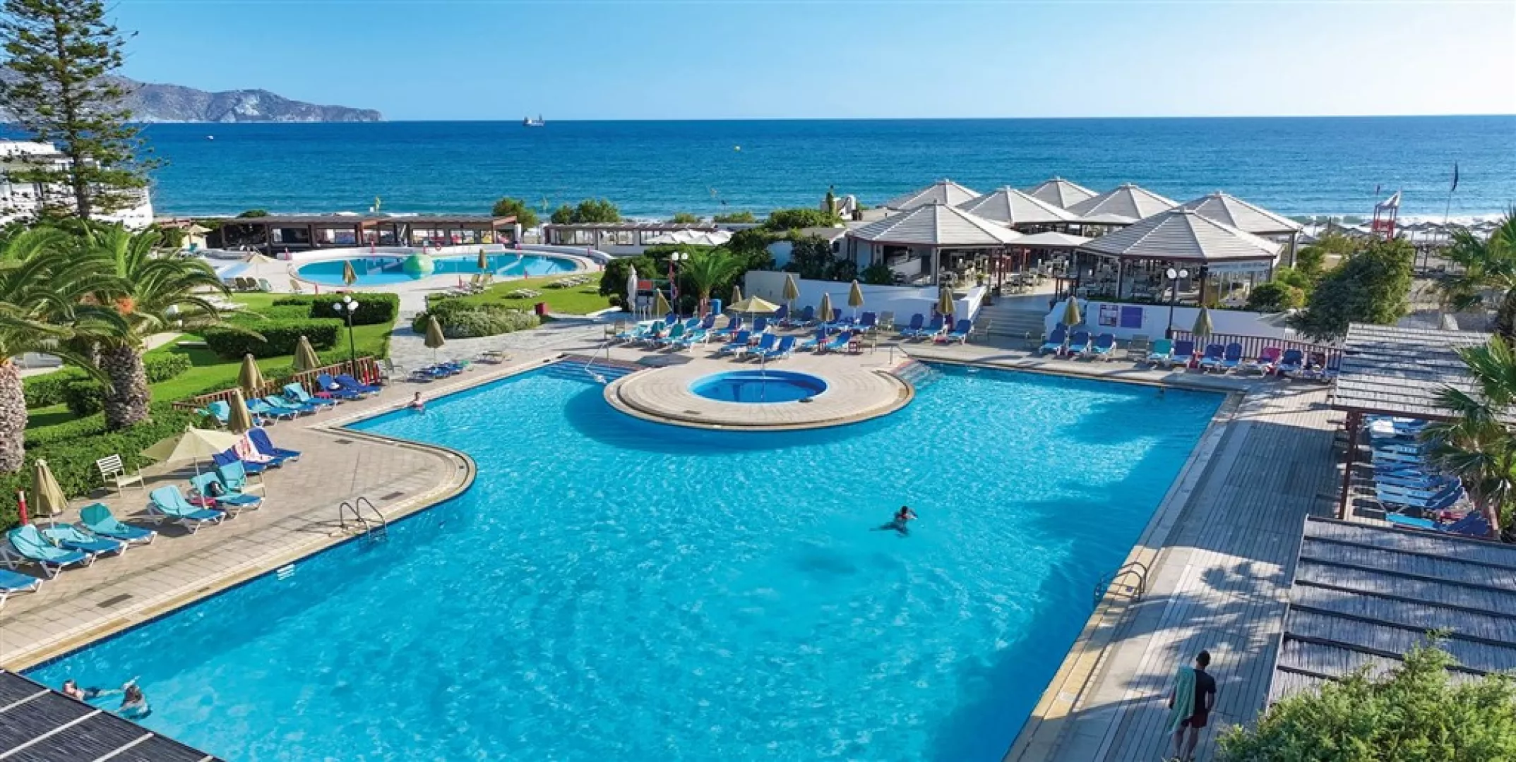 Hotel disponuje elegantnou a priestrannou vstupnou halou s 24-hodinovou recepciou, lekárom (za poplatok), lobby barom, a hlavnou reštauráciou s vnútorným aj vonkajším sedením. Hostia môžu využiť á la carte reštaurácie (grécka, talianska a vegánska), snack bar, diskotéku, 2 veľké bazény (so sladkou a morskou vodou), bazén so šmykľavkou a toboganom, detský bazén, SPA & wellness centrum (masáže, sauna za poplatok), hotelový minimarket a 2 tenisové kurty (večerné osvetlenie za poplatok). Takisto sú k dispozícii široké možnosti vodných športov na pláži (za poplatok), wifi v celom areáli, detský miniklub, a rôzne športové vyžitie ako stolný tenis, minigolf, aerobik, futbal, basketbal, plážový volejbal, vodné pólo a lukostreľbu.