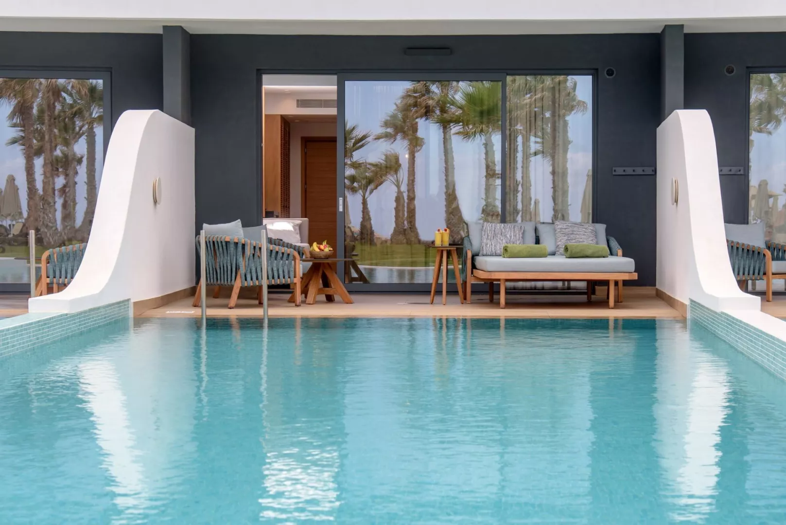 Dvojlôžkové izby, rozdelené do rôznych typov s rôznymi výhľadmi, sú vybavené kúpeľňou s WC, klimatizáciou, telefónom, satelitnou TV, minichladničkou, trezorom a setom na prípravu kávy a čaju. Rodinné izby majú dve oddelené spálne a sú prispôsobené pre väčšie rodiny. Najluxusnejšie izby, ako Junior Suita a suity s privátnym bazénom, ponúkajú výhľad na more a neobmedzený vstup do á la carte reštaurácií.