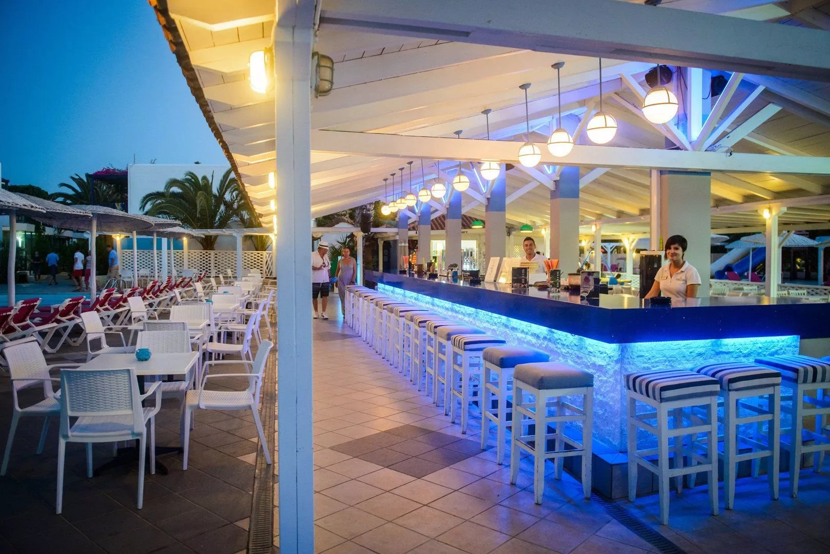 All inclusive program zahŕňa raňajky (07:30 – 10:00), obedy (12:30 – 14:30) a večere (19:00 – 21:30) formou bufetu. Počas dňa sú dostupné zmrzliny, snacky a ľahké občerstvenie, ako aj nealkoholické a alkoholické nápoje miestnej výroby v stanovených časoch. Po predchádzajúcej rezervácii je možné vychutnať si večeru v jednej zo štyroch á la carte reštaurácií (v susednom hoteli Stella Pallace, nie je zahrnutá v rámci All Inclusive). Počas večere sa od mužov vyžadujú dlhé nohavice.