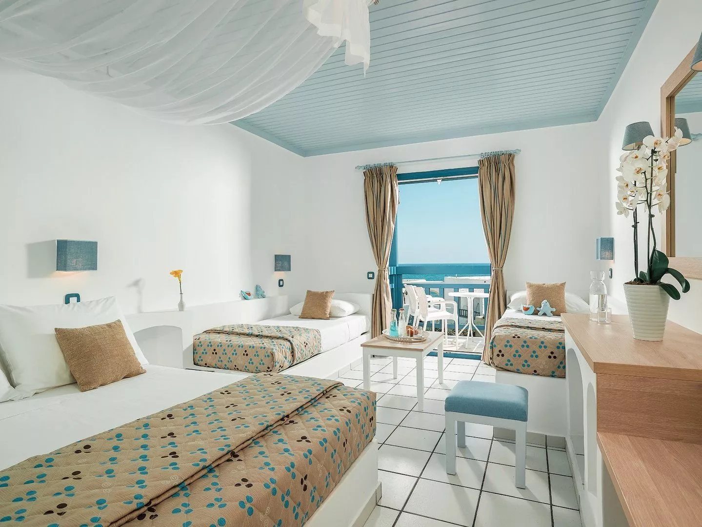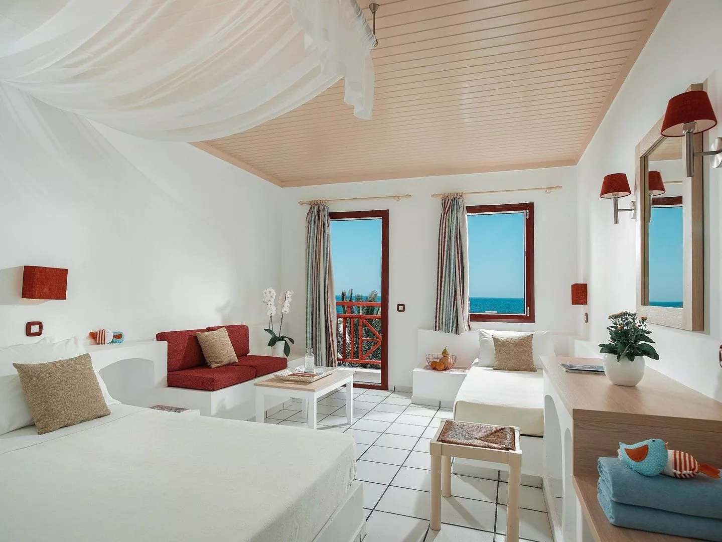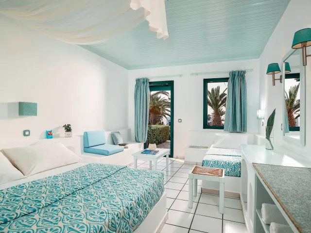 Izby sú dvojlôžkové s vlastným sociálnym zariadením, s možnosťou prístelky, klimatizáciou, SAT/TV, telefónom, Wi-Fi a minichladničkou. Každá izba má terasu alebo balkón. K dispozícii sú aj izby s výhľadom na more a rodinné izby, ktoré sú priestrannejšie.