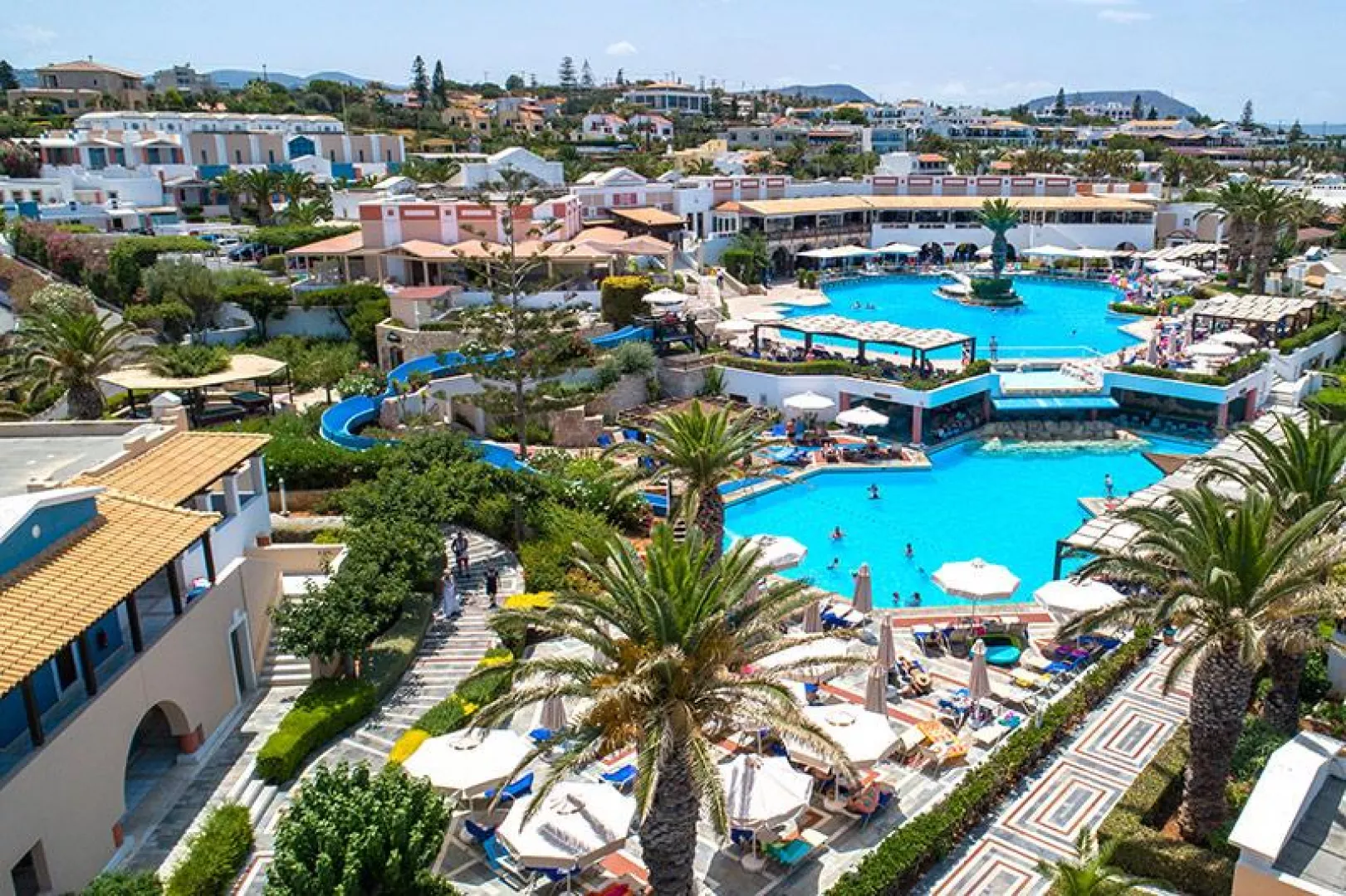 Luxusný hotelový komplex sa nachádza v tichej časti vyhľadávaného letoviska Hersonissos, kde nájdete množstvo obchodíkov a reštaurácií. Hotel je zasadený v rozľahlej subtropickej záhrade s jedinečnou palmovou alejou a ponúka bohaté animačné aktivity pre všetky vekové kategórie.