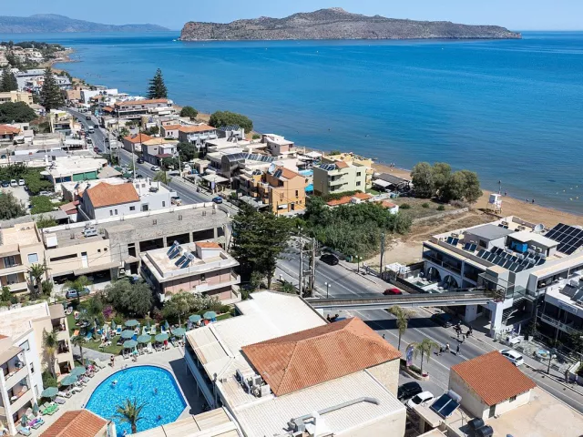 Hotel Creta Palm je situovaný priamo pri piesočnatej pláži v oblasti Chania na ostrove Kréta. Okolie hotela ponúka možnosti na rôzne vodné športy a relaxáciu na pláži.