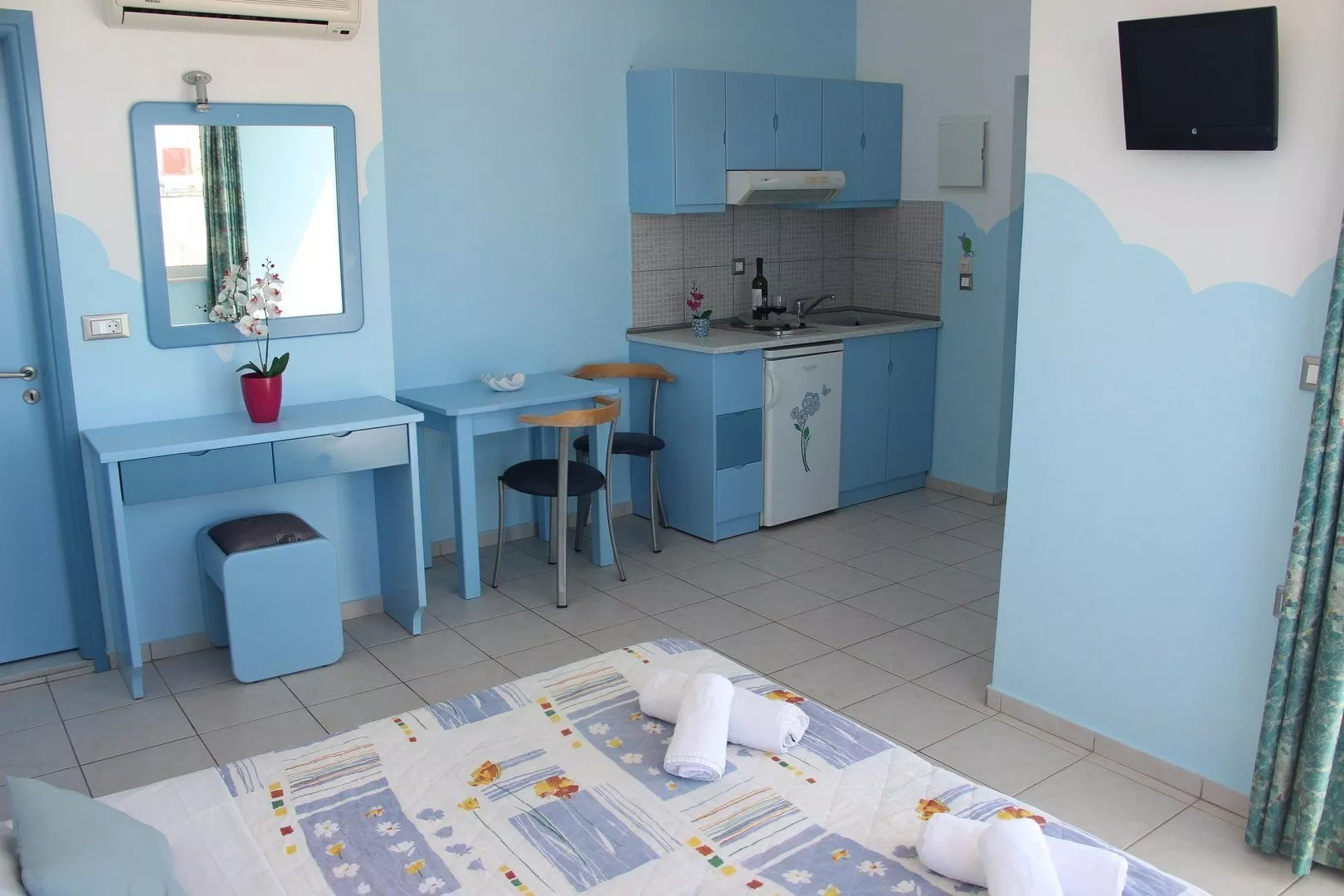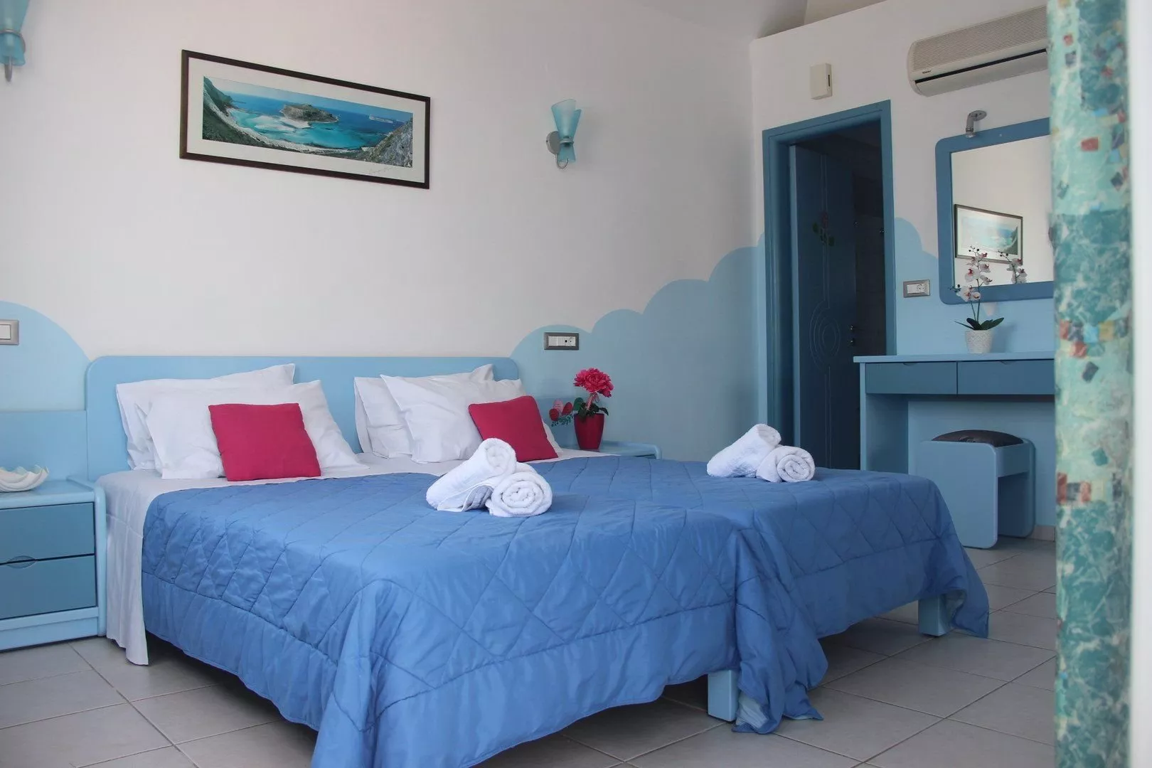 Izby sú vybavené vlastným sociálnym zariadením (WC, kúpeľňa, fén), televíziou, kuchynským kútom a zariadením na prípravu kávy či čaju. Každá izba má balkón alebo terasu. Trezor a klimatizácia sú k dispozícii za príplatok (cca 5 EUR / týždeň a cca 50 EUR / týždeň, resp.). Rodinné izby pozostávajú z dvoch miestností a majú rovnaké vybavenie ako dvojlôžkové izby.