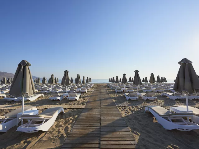 široká piesočnatá pláž s pozvoľným vstupom do mora, ležadlá, slnečníky a osušky (zdarma),