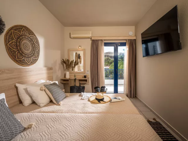 Klimatizované izby vybavené TV so satelitným príjmom, telefónom, mini chladničkou, trezorom, kúpeľňou s WC a sušičom vlasov. Každá izba má balkón alebo terasu.