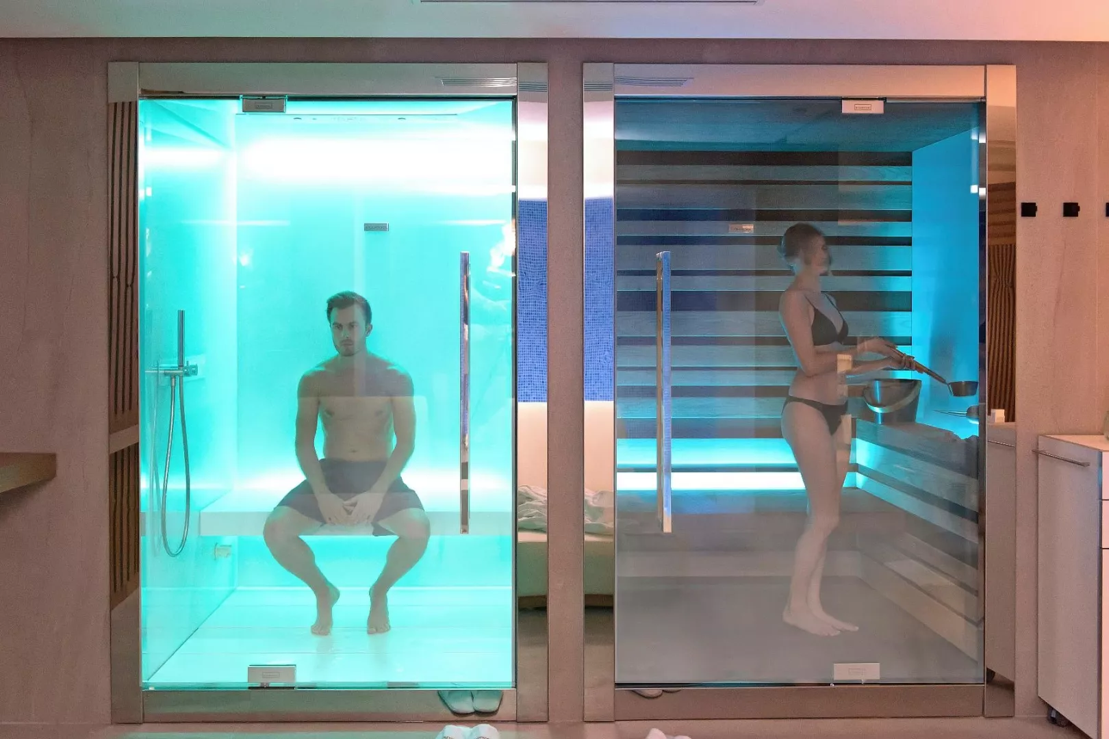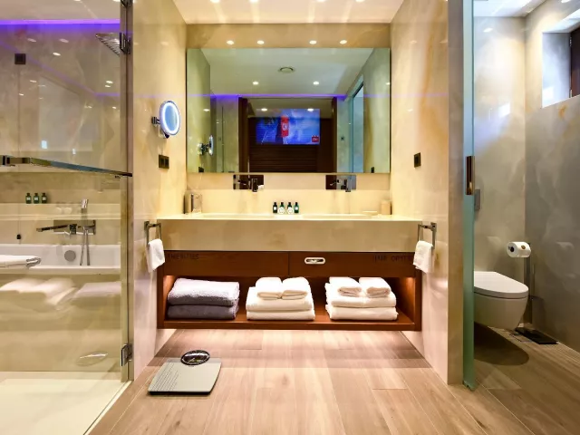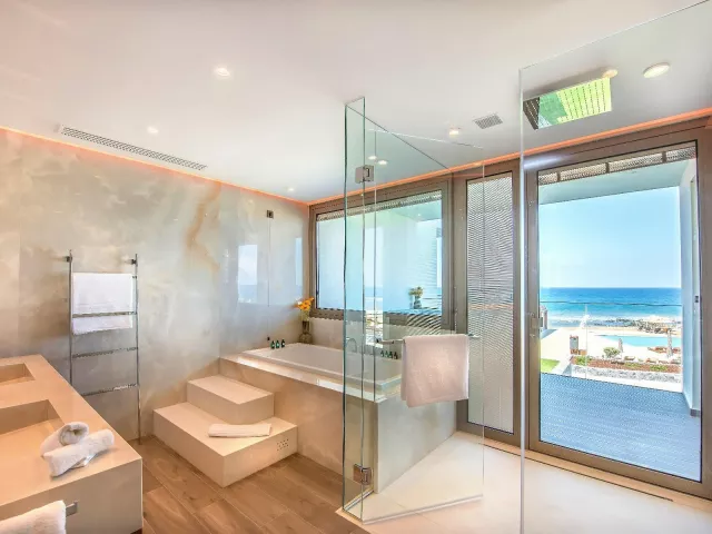 Junior Suita, Deluxe, Pool Front, Výhľad na more: kúpeľňa/WC (sušič vlasov, župany a papuče), klimatizácia, minibar za poplatok, TV/sat., trezor, telefón, set na prípravu kávy a čaju, Nespresso, denne doplňovaná voda, terasa s ležadlami, privátny bazén, vyhrievanie na viac ako 22 stupňov za poplatok), veľkosť izby cca 45m2. Ostatné typy izieb (pokiaľ nie je uvedené inak, majú izby vyššie uvedené vybavenie) Junior Suita, Deluxe, Výhľad na more, Súkromný bazén: privátny vyhrievaný bazén (cca 21m2, vyhrievanie na viac ako 22 stupňov za poplatok), veľkosť izby cca 45m2 Suita, Aqua Marine, Gym, Water Front: vonkajšia vyhrievaná vírivka (vyhrievanie na viac ako 22 stupňov za poplatok), privátna posilňovňa, veľkosť izby cca 82m2 Suita, Energy, Premium, Sauna: privátny vyhrievaný bazén (cca 22m2, vyhrievanie na viac ako 22 stupňov za poplatok), privátna sauna v izbe, veľkosť izby cca 70m2 Suita, 2 floors, Supreme, Výhľad na more: privátny vyhrievaný bazén (cca 20m2, vyhrievanie na viac ako 22 stupňov za poplatok), 2. poschodia, spálňa na poschodí, obývacia izba na prízemí, 2 kúpeľne, veľkosť izby cca 90m2 Suita, Executive, Fitness, Gym: výhľad na more, privátny vyhrievaný bazén (cca 20-34m2, vyhrievanie na viac ako 22 stupňov za poplatok), privátna posilňovňa, veľkosť izby cca 75-82m2 Honeymoon Suita, Gym, Sauna, Výhľad na more: privátny vyhrievaný bazén (cca 23m2, vyhrievanie na viac ako 22 stupňov za poplatok), privátna posilňovňa, privátna sauna, veľkosť izby cca 78m2 Ambassador Suita, Gym, Výhľad na more, Súkromný bazén: spálňa a obývacia izba oddelená posuvnými dverami, privátny vyhrievaný bazén (cca 29-32m2, vyhrievanie na viac ako 22 stupňov za poplatok), privátna posilňovňa, veľkosť izby cca 88-92m2 Vila, 2 spálne, Luxury, Princess: výhľad na more, 2 spálne a obývacia izba oddelené dverami, 2 kúpeľne, privátny vyhrievaný bazén (cca 38m2, vyhrievanie na viac ako 22 stupňov za poplatok), veľkosť izby cca 110m2 Vila, 2 Spálňa, 2 floors, Princess: výhľad na more, spálňa a obývacia izba oddelená dverami na prízemí, druhá spálňa na poschodí, 2 kúpeľne, privátny vyhrievaný bazén (cca 40m2, vyhrievanie na viac ako 22 stupňov za poplatok), na poschodí na balkóne vyhrievaná 175m2 Dream Vila, 2 spálne, 2 floors, Princess: výhľad na more, spálňa a posilňovňa na prízemí, na poschodí druhá spálňa, sauna a na balkóne vyhrievaná vírivka, privátny vyhrievaný bazén (cca 58m2, vyhrievanie na viac ako 22 stupňov za poplatok), veľkosť izby