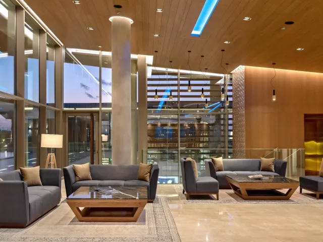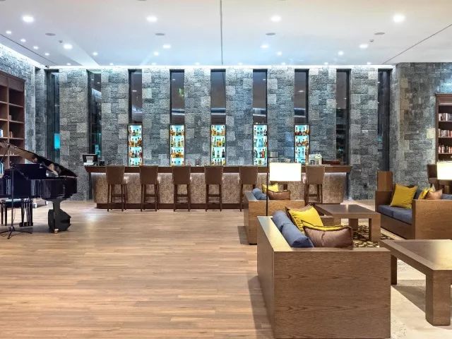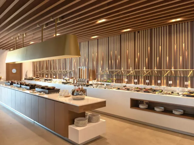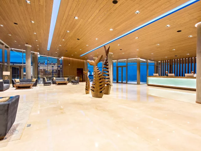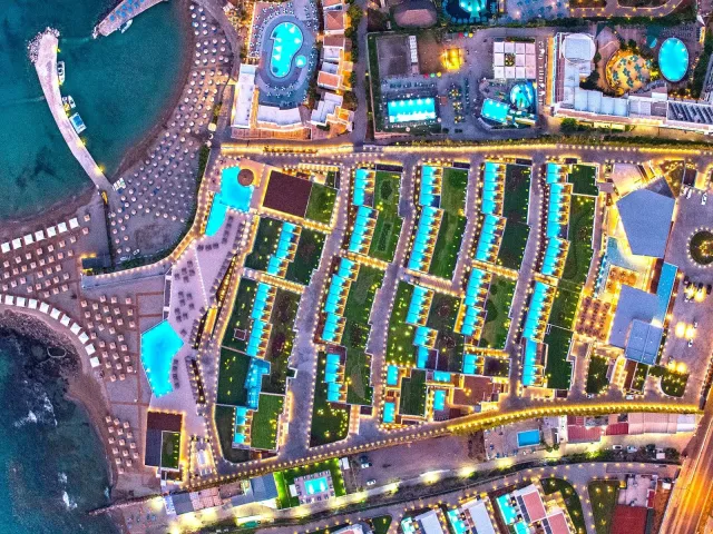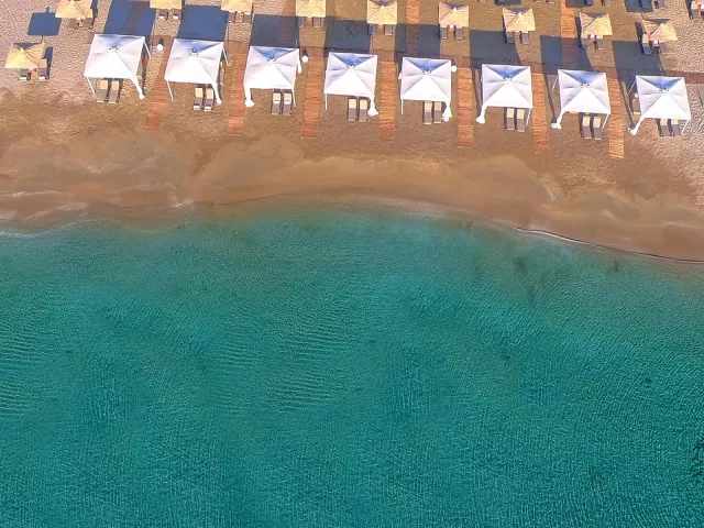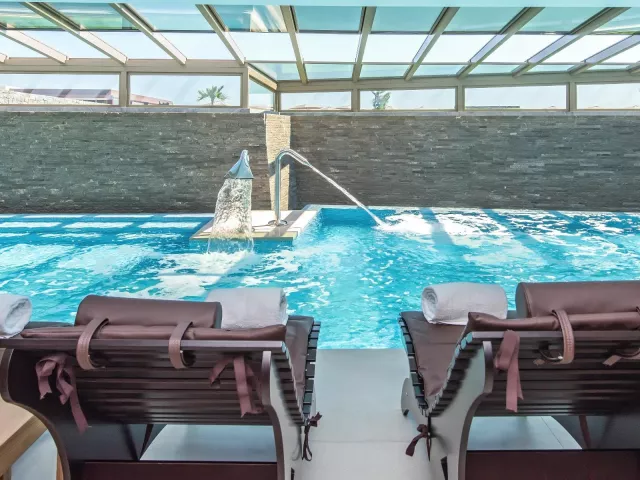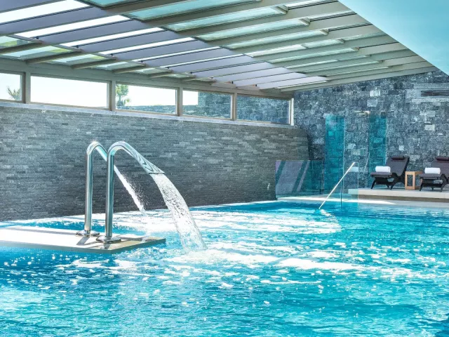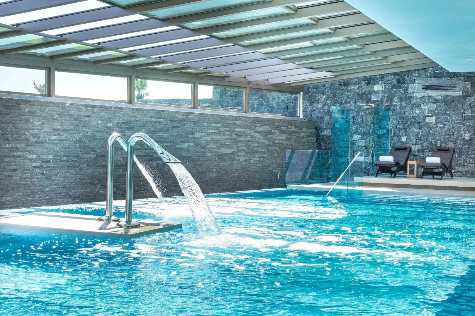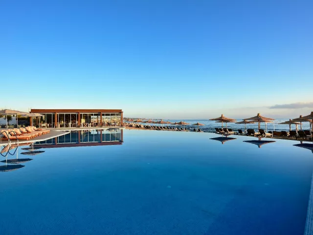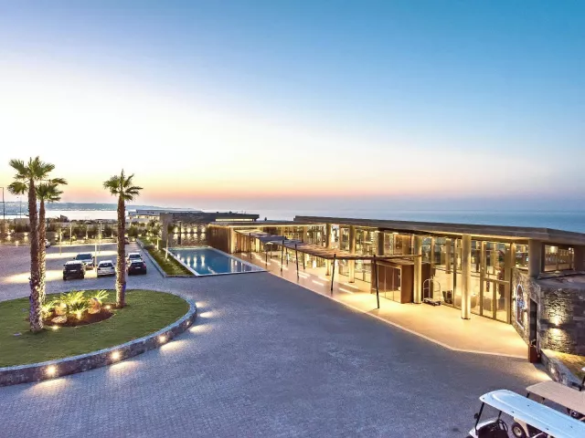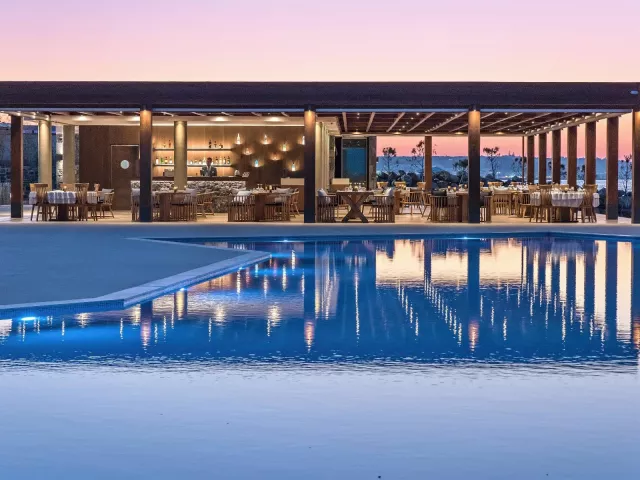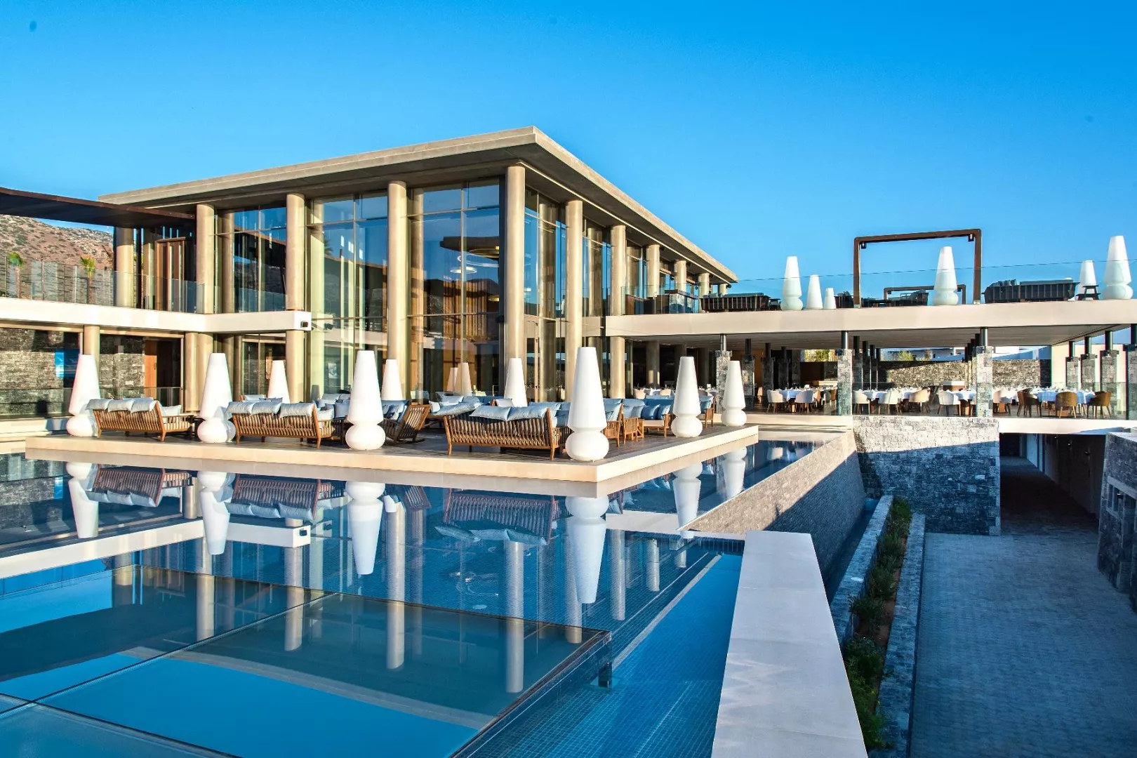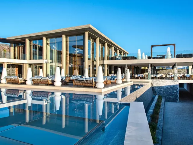 112 suite a víl, väčšinou s privátnym bazénom, vstupná hala s recepciou, občerstvenie pri prílete, lobby bar, hlavná reštaurácia, reštaurácia à la carte. Vonku 2 bazény s morskou vodou, terasa na slnenie, ležadlá, slnečníky a osušky zadarmo, bar pri bazéne.