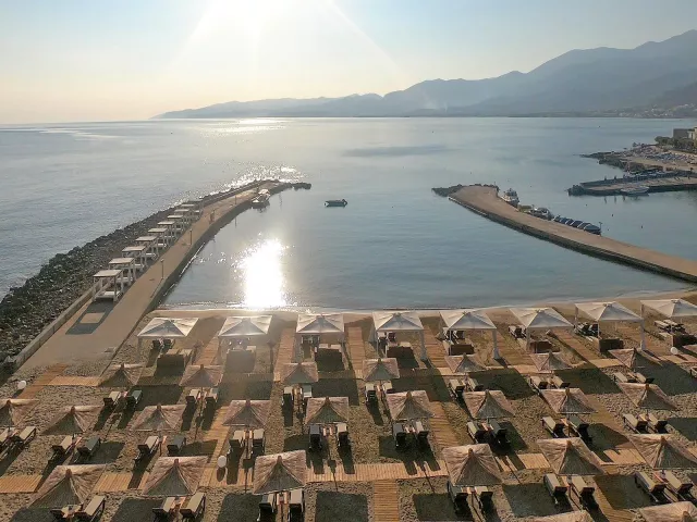 Piesočná pláž priamo pri hoteli. Ležadlá, slnečníky a osušky zadarmo, bar na pláži.