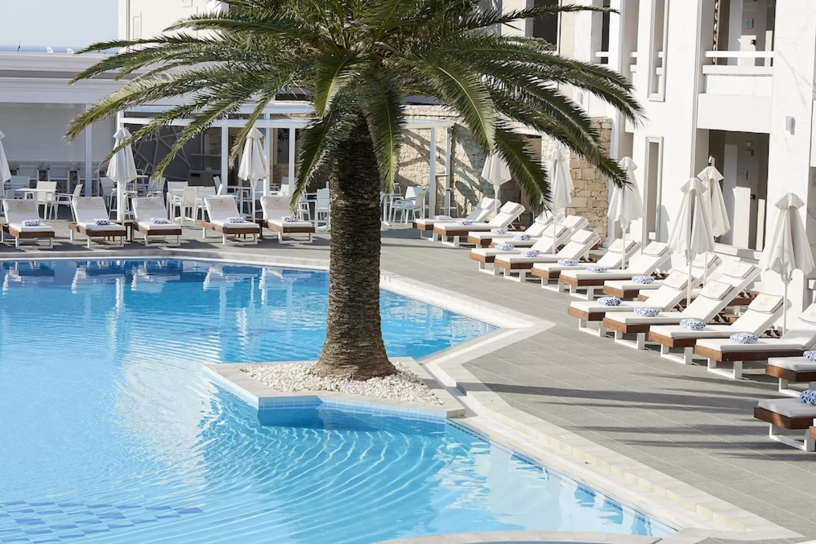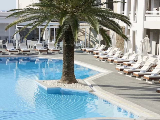 Mythos Palace Resort & SPA je novo zrekonštruovaný hotel pozostávajúci z hlavnej budovy a troch vedľajších blokov situovaných v záhrade, priamo pri širokej piesočnatej pláži. Ubytovanie je k dispozícii v štandardných izbách s výhľadom na okolité hory alebo more. Hostia môžu relaxovať pri bazéne alebo na pláži, pričom hotel ponúka aj rôzne športové vyžitie. V blízkosti sa nachádzajú taverne a obchody, čo je ideálnou možnosťou pre rodiny s deťmi a klientov všetkých vekových kategórií.