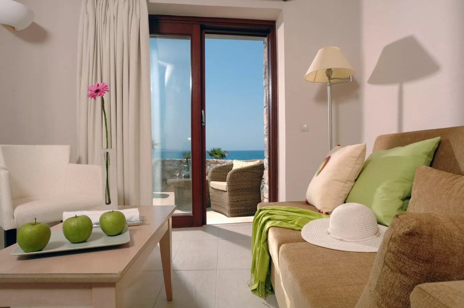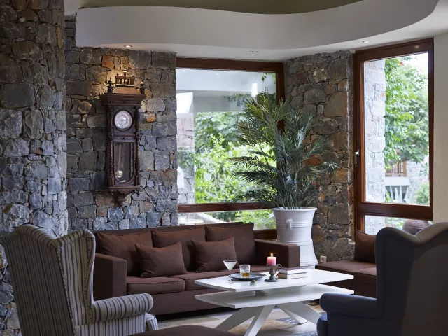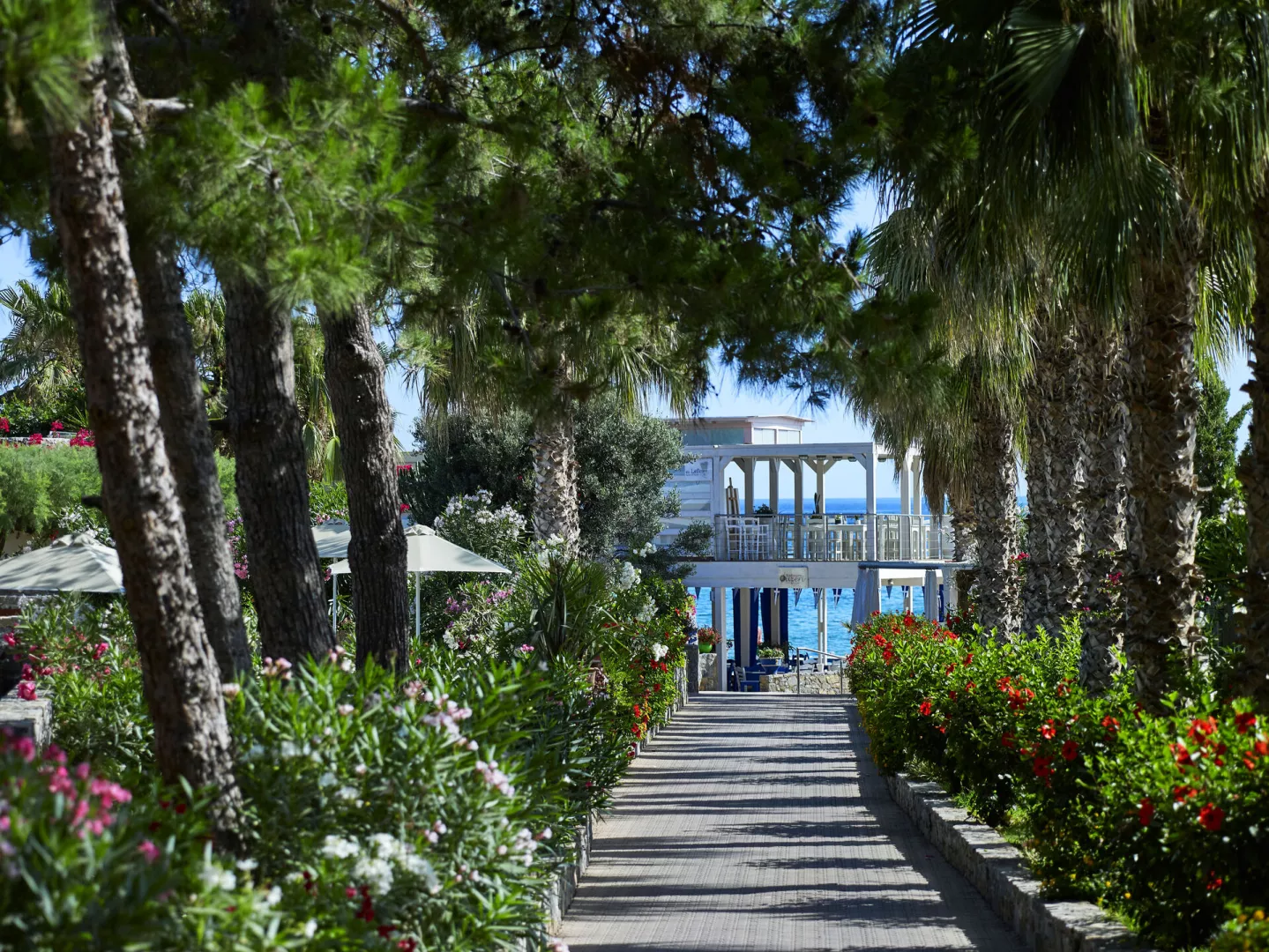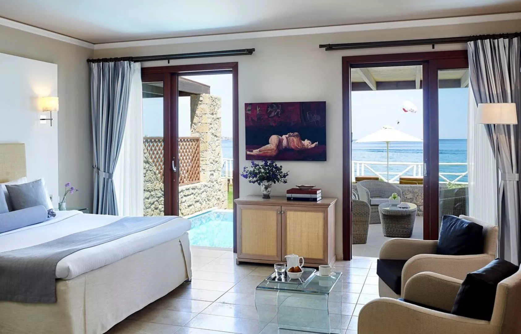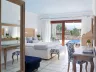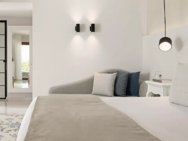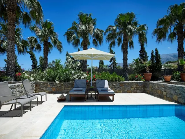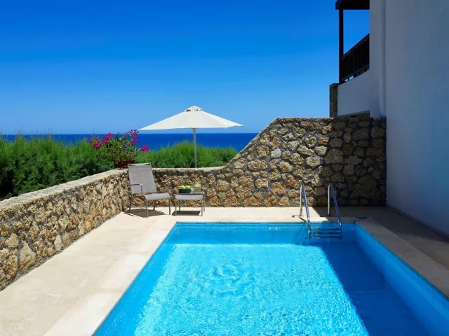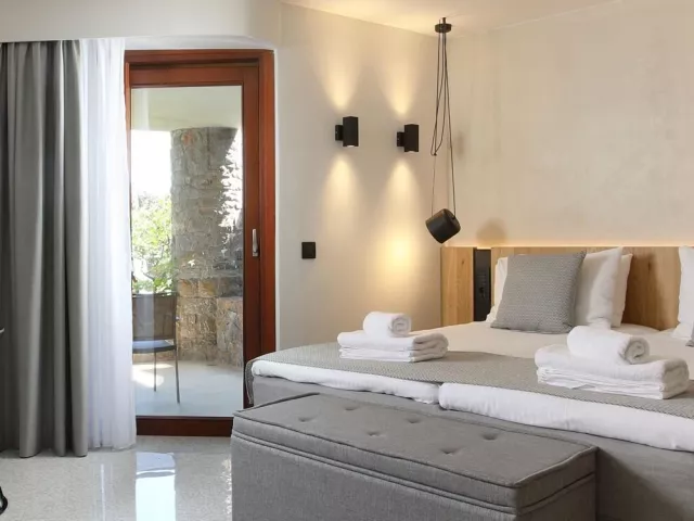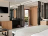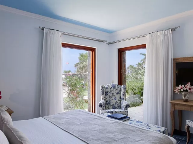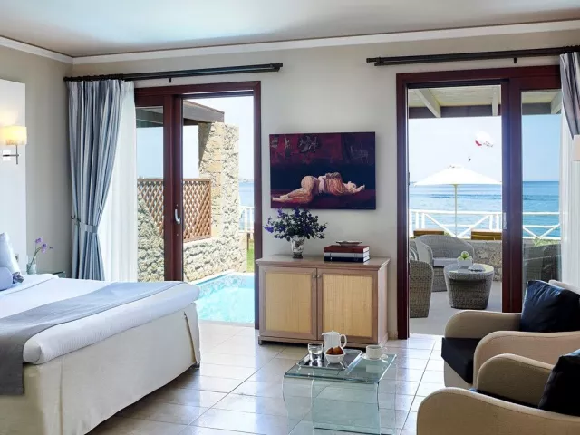 Rôzne varianty izieb majú výhľad do záhrady alebo na more, pričom súkromné bazény a vírivky sú dostupné v niektorých bungalovoch a suitách.