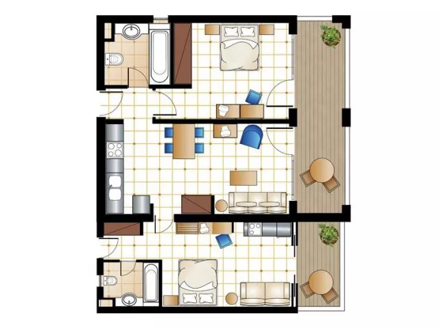 Dvojlôžková izba s výhľadom do záhrady je vybavená kúpeľňou/WC (sušič vlasov), klimatizáciou, TV/sat., mini-hifi, chladničkou, trezorom a balkónom alebo terasou. Viacero typov izieb je k dispozícii, vrátane bungalovov, rodinných izieb a mezonetov s rôznymi výhľadmi.