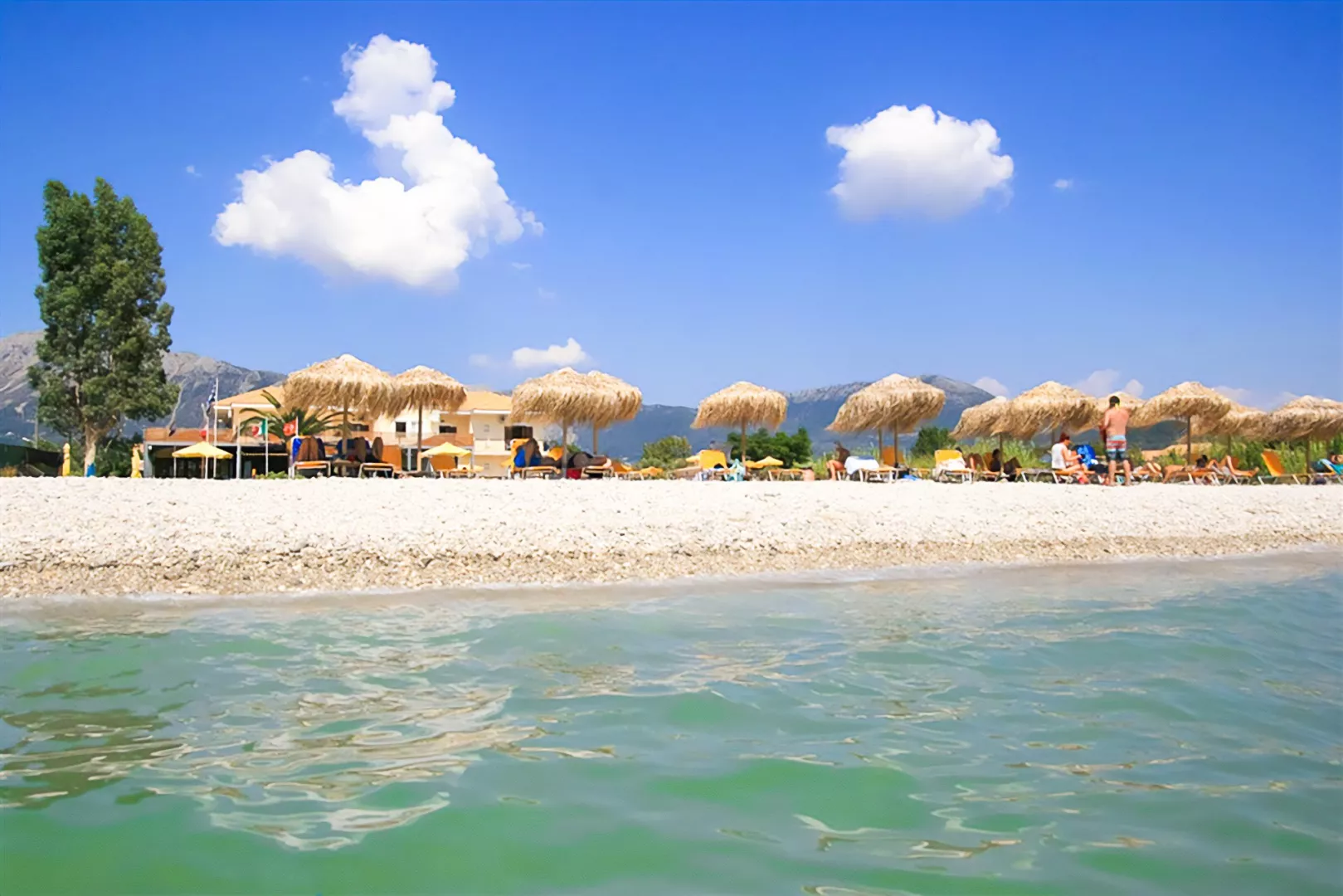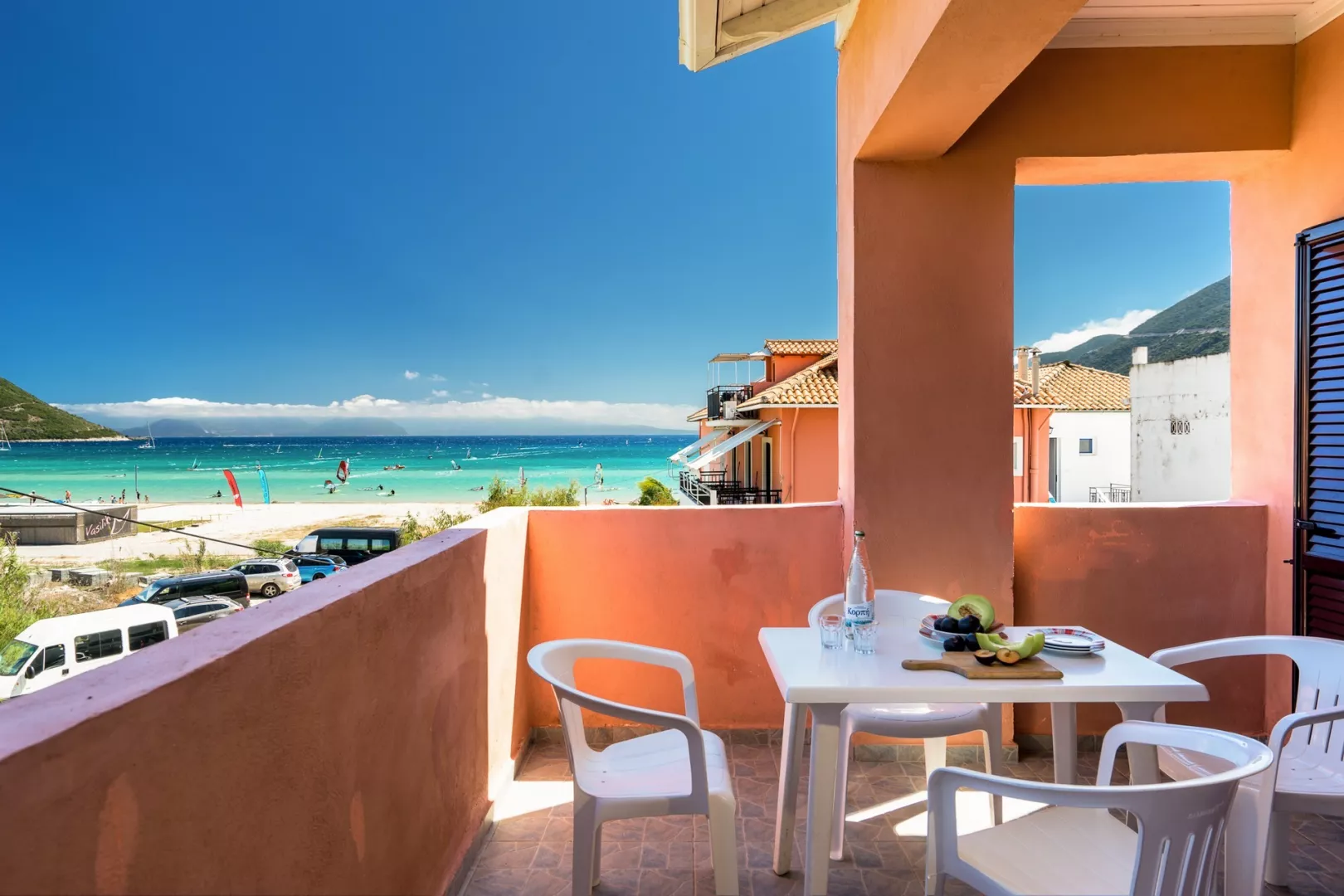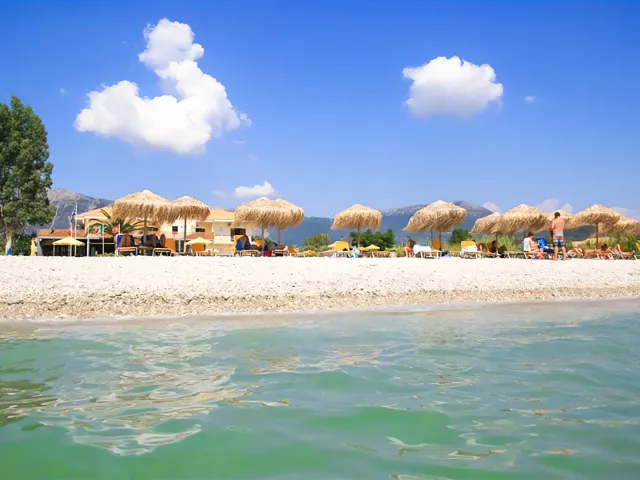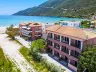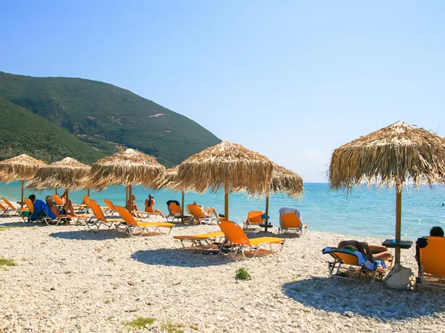 len 60 m od hotela 1 km dlhá kamienková a piesočnatá pláž s pozvoľným vstupom do mora ležadlá a slnečníky za poplatok pláž na vodné športy, veľká základňa na windsurfing na krásnu pláž Agiofilli sa dostanete lodným taxíkom z centra Vassiliki alebo pešo