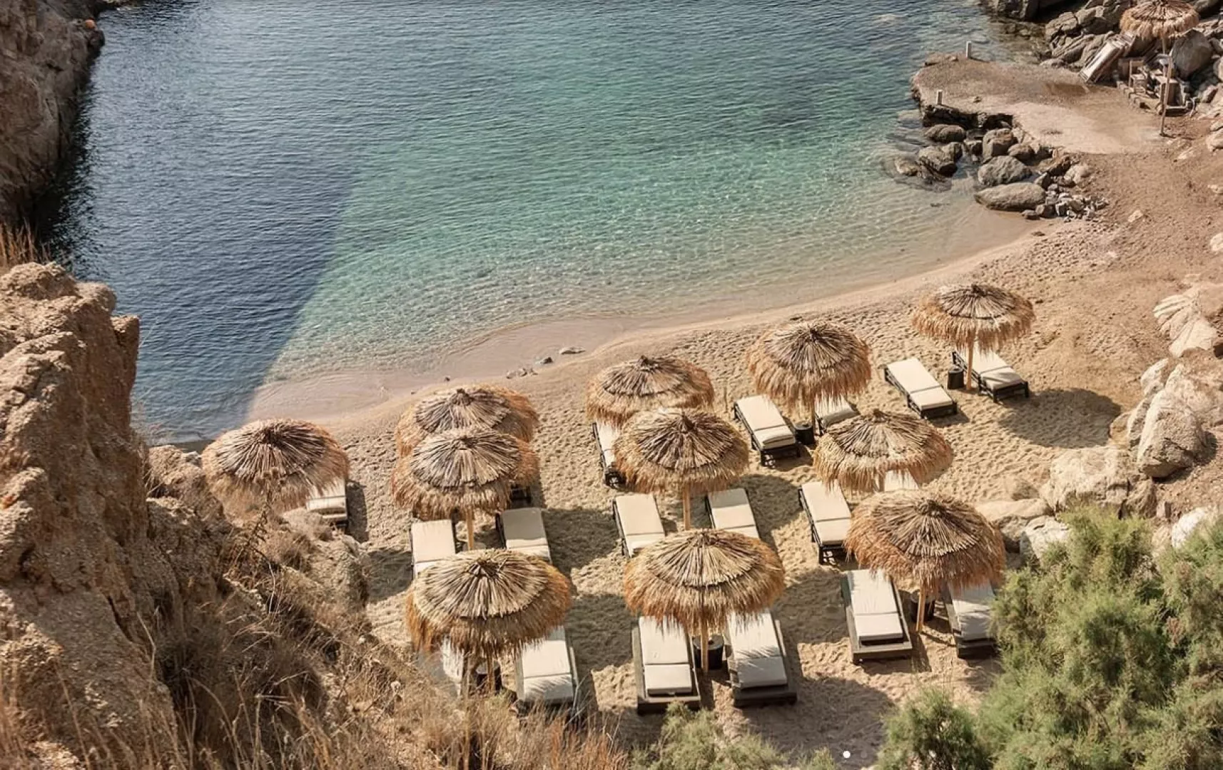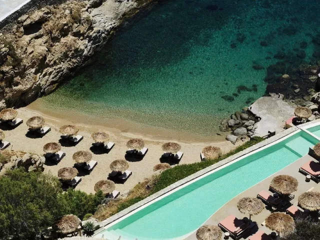 Menšia piesočnatá pláž s pozvoľným vstupom sa nachádza priamo pri hoteli a je prístupná po schodoch. K dispozícii sú obmedzené množstvá ležadiel a slnečníkov. Väčšia verejná pláž Agia Anna je vzdialená približne 230 m od hotela.