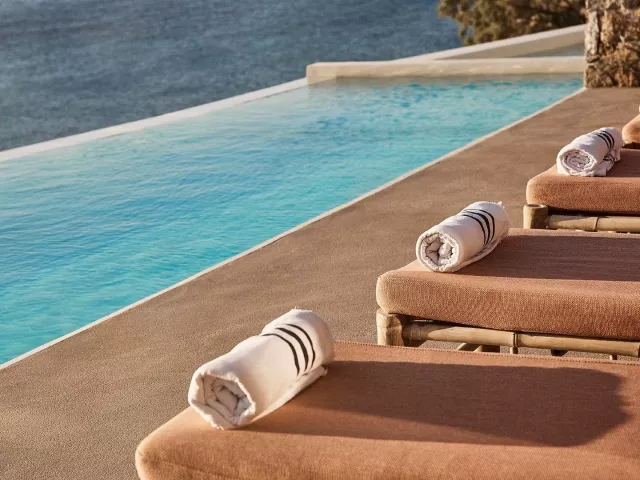 Izba typu Double Deluxe s výhľadom na more má cca 21-25 m² a je zariadená v zemitých farbách s manželskou posteľou alebo dvoma samostatnými lôžkami, kúpeľňou so sprchou, županmi, TV, trezorom, minibarom, WiFi a balkónom alebo terasou s posedením. Superior Suite ponúka rovnaké vybavenie ako Double Deluxe, má 29-35 m² a výhľad na more. Signature Suite disponuje rovnakým vybavením s privátnym ochladzovacím bazénikom a výhľadom na more (cca 30-35 m²). Vila so svojimi dvoma spálňami ponúka druhú spálňu s druhou kúpeľňou a výhľadom na more, privátnu terasu s bazénom a ležadlami s rozlohou cca 75 m².