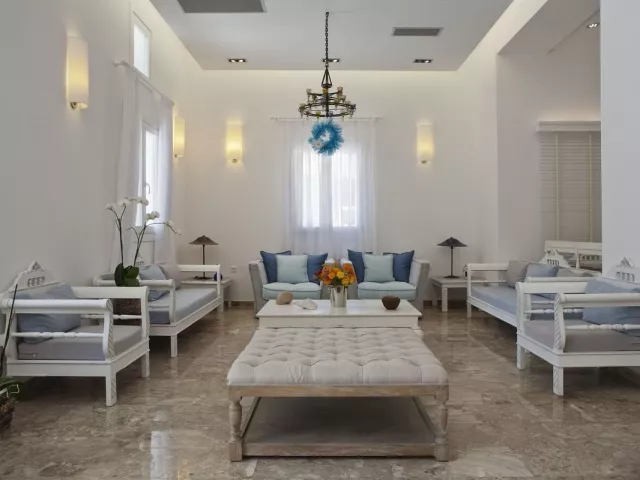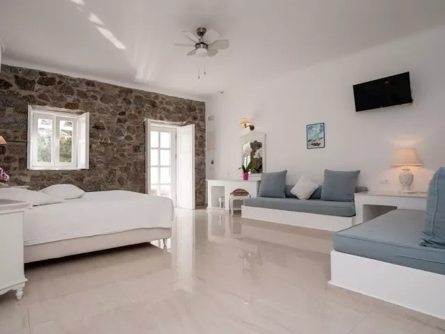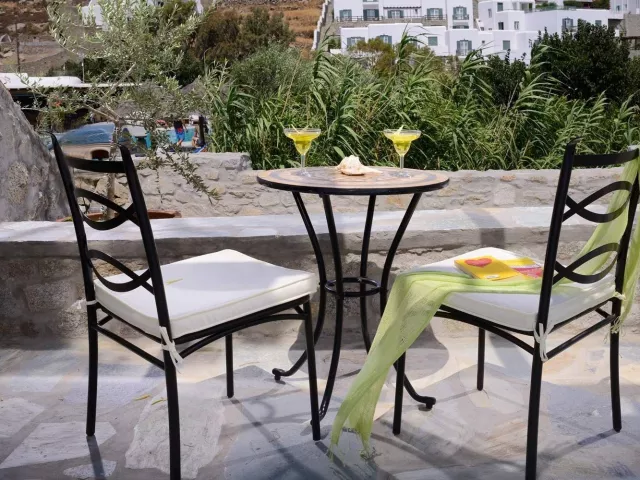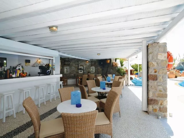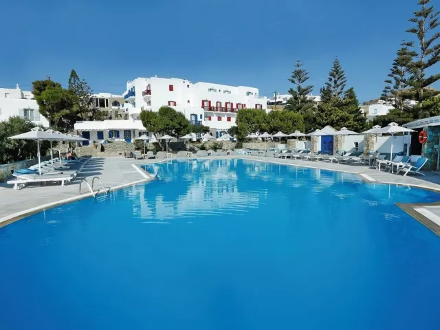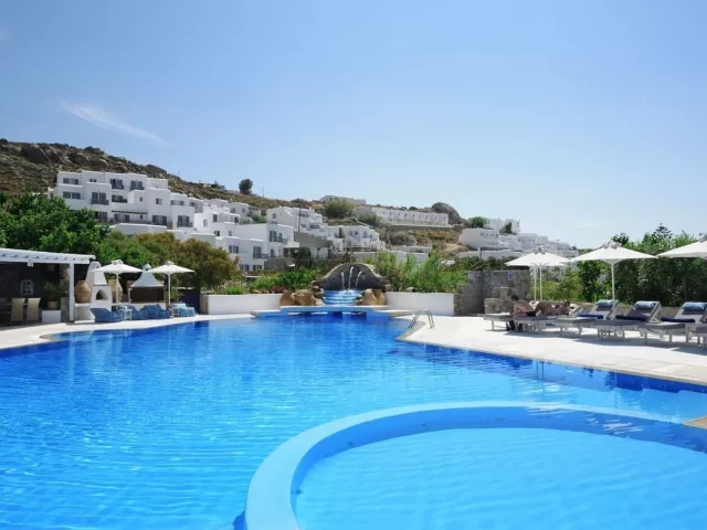 Hotel sa nachádza medzi dvoma známymi plážami Platys Gialos a Psarou Beach, približne 200 m od Platys Gialos. Priamo pri hoteli sa nachádza požičovňa automobilov a autobusová zastávka. Hlavné mesto Mykonos je vzdialené cca 4 km.