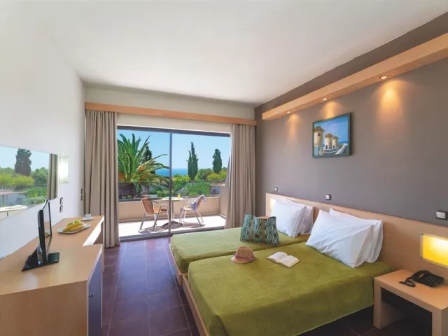 Moderný hotel pozostáva z viacerých budov a ponúka vstupnú halu s recepciou a hlavným lobby barom, hlavnú reštauráciu s gréckou a medzinárodnou kuchyňou, pool bar a snack bar. Udržiavaná záhrada s veľkým bazénom a samostatným detským bazénom poskytuje príjemné prostredie na relaxáciu. K dispozícii sú ležadlá a slnečníky pri bazéne, detské ihrisko, tenisový kurt, stolný tenis, fitness, minimarket a obchod so šperkami. Hotel organizuje denné a večerné animácie pre deti aj dospelých.
