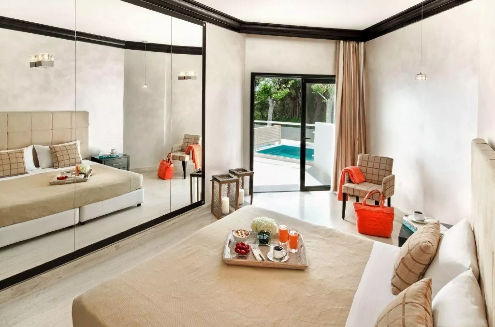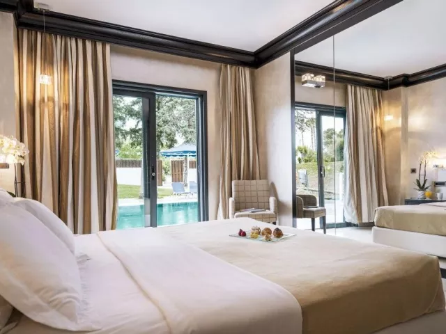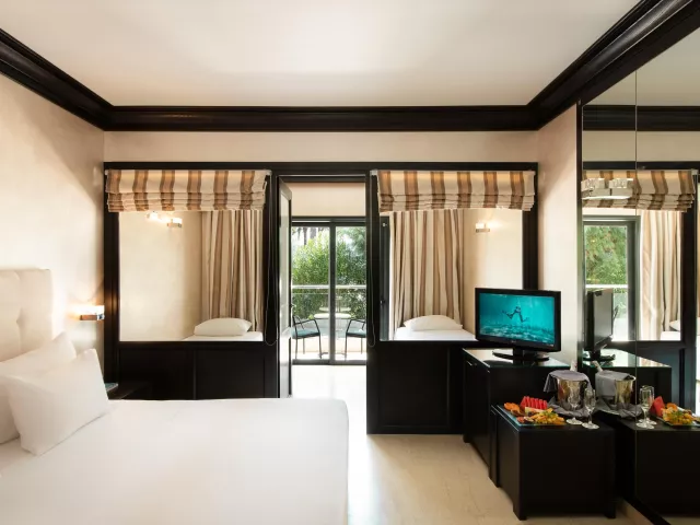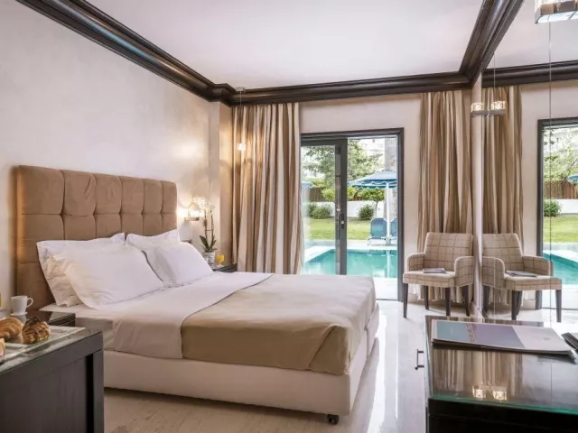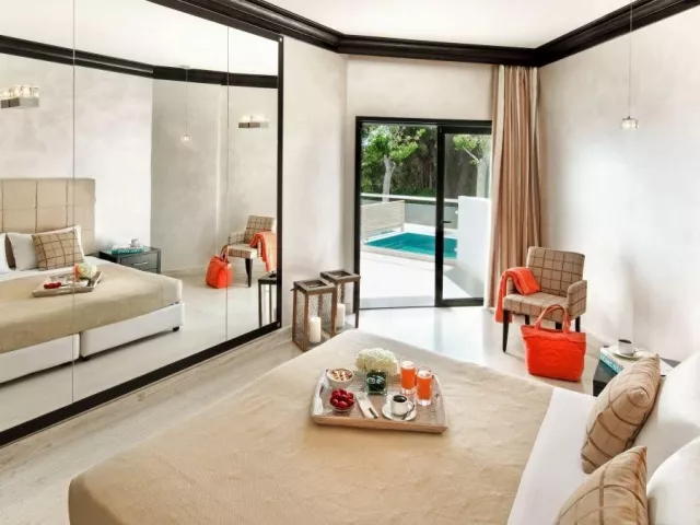Hotel ponúka rôzne typy izieb, vrátane dvojlôžkových izieb s bočným výhľadom na more, štvorlôžkových izieb s výhľadom na krajinu a more, rodinných izieb s prepážkou, a izieb so súkromným bazénom. Vybavenie izieb zahŕňa klimatizáciu, TV, mini chladničku, trezor, balkón alebo terasu a ďalšie pohodlné zariadenia.