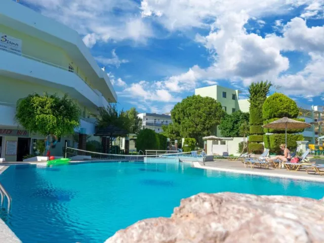 Hotel Stamos, ktorý bol renovovaný v roku 2019, sa nachádza v blízkosti centra Faliraki. Najbližšie obchody, taverny a bary sú vzdialené približne 400 m. Centrum leží cca 500 m od hotela a letisko je vzdialené okolo 20 km.